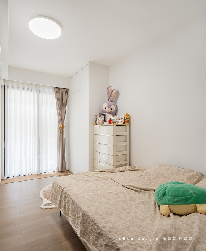 兒童房整體色調(diào)以淡雅的米白色為主,奶fufud超溫柔,給人寧靜舒適的感覺。靠墻放置一個(gè)落地架子增加收納空間