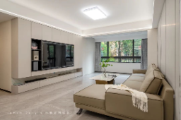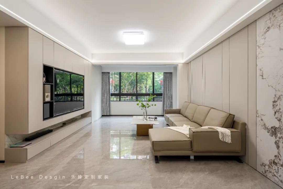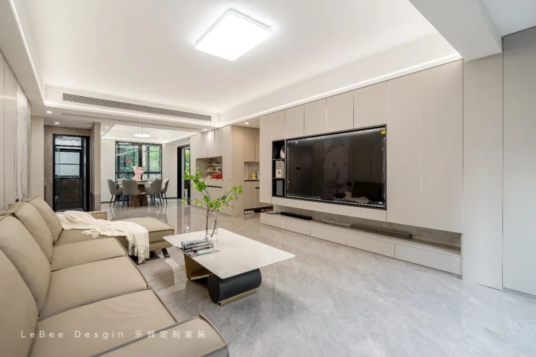 功能融合:電視背景定制收納柜,兼顧美觀與實(shí)用;沙發(fā)后方預(yù)留靈活活動區(qū),可隨需求調(diào)整為親子互動或臨時客臥。