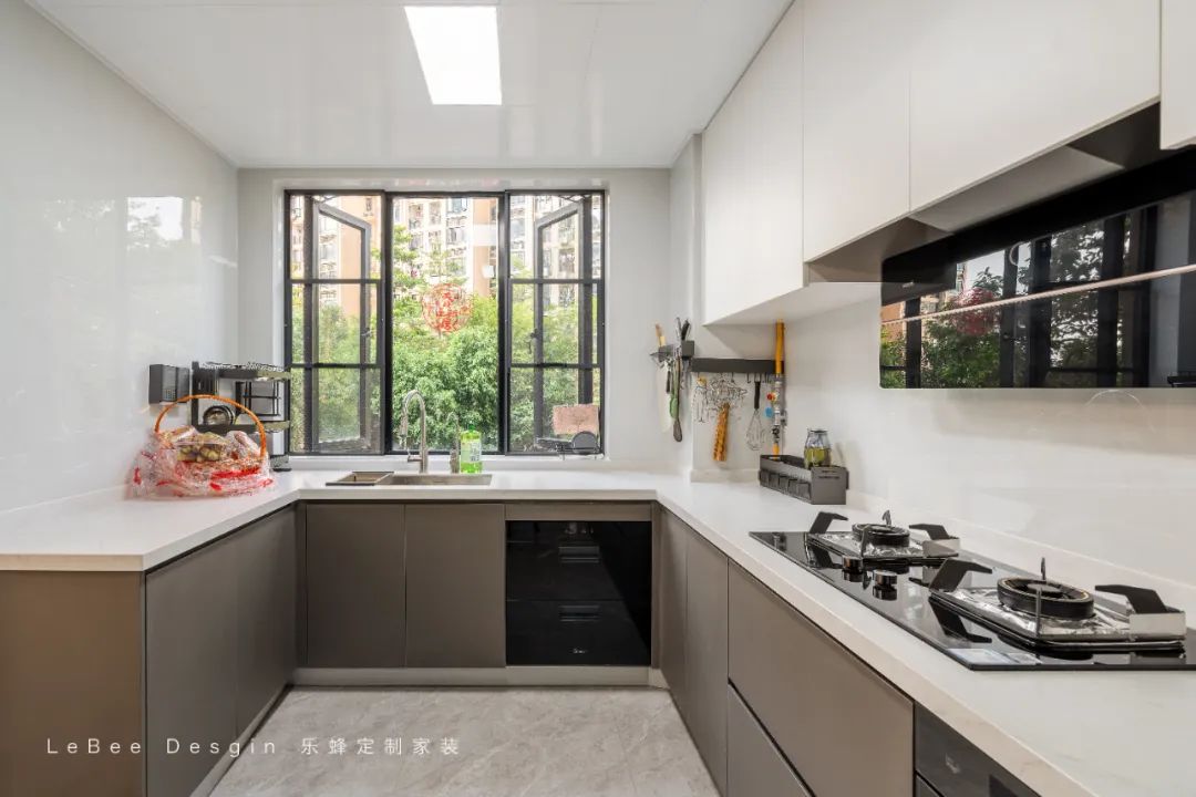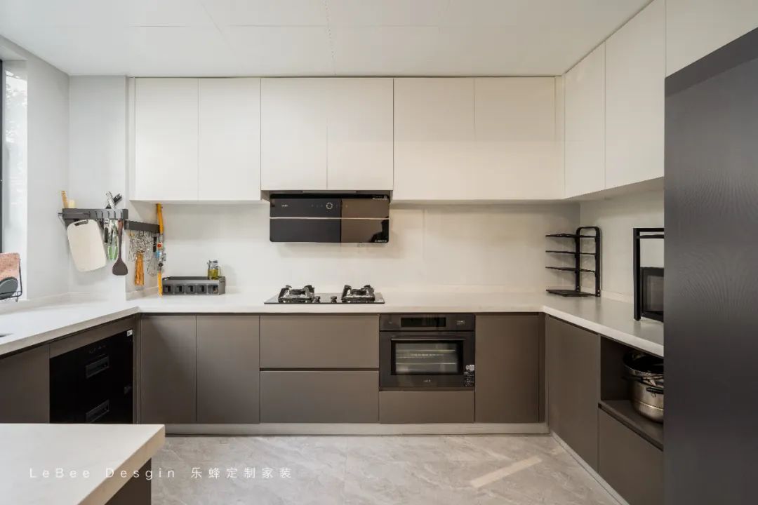 細(xì)節(jié)亮點(diǎn):櫥柜拼色設(shè)計、折疊備餐板,提升操作效率,U型設(shè)計串聯(lián)空間視覺。