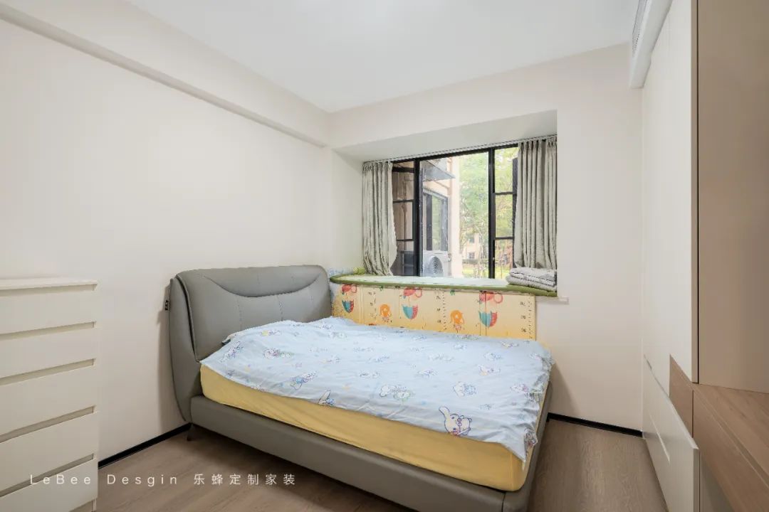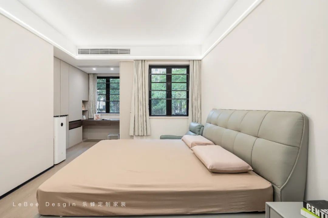 主臥是空間以人字拼橡木地板通鋪串聯(lián)整體,淺色系墻面與定制成品床呼應(yīng),巧妙改造飄窗為步入式“衣帽間“:向外拓展30cm地臺,頂部線性燈帶營造懸浮光影。