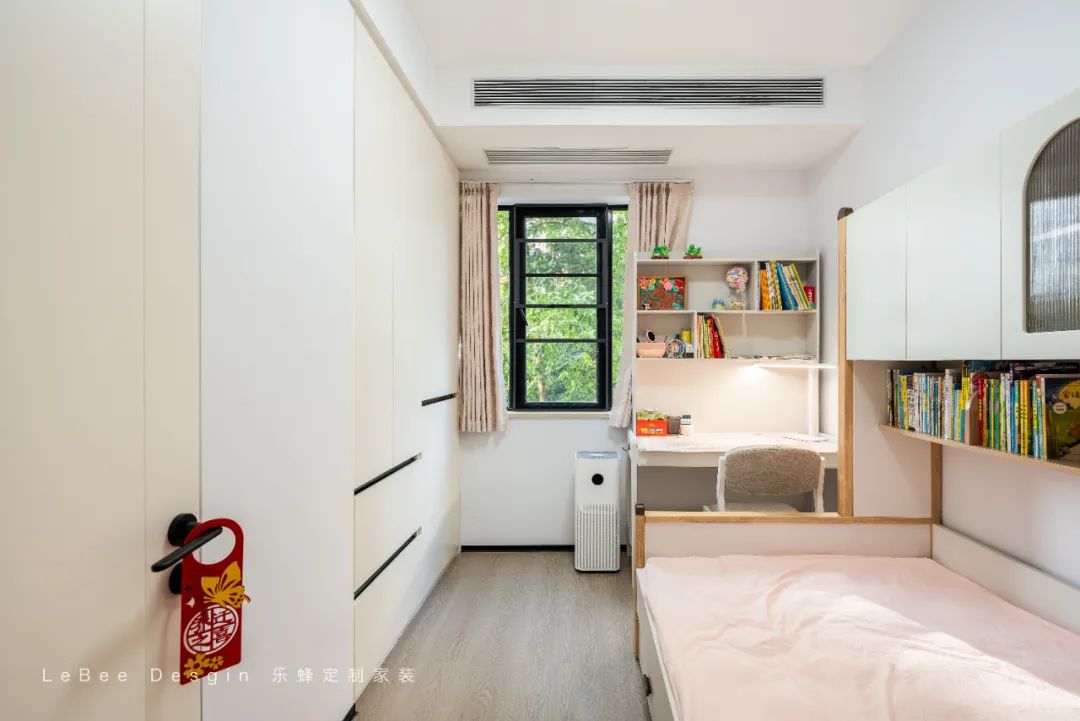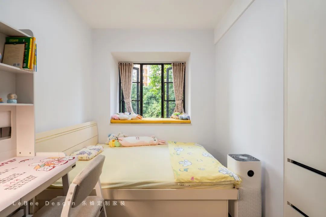 女孩房粉色系搭配木質(zhì)家具,利用飄窗空間收納書籍與玩具,未來可隨年齡調(diào)整布局。