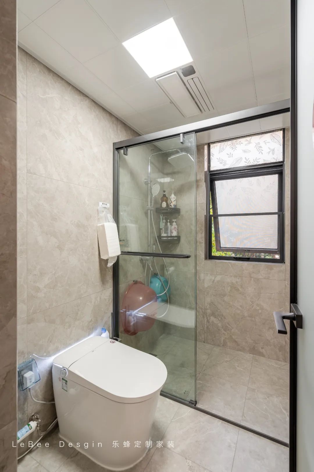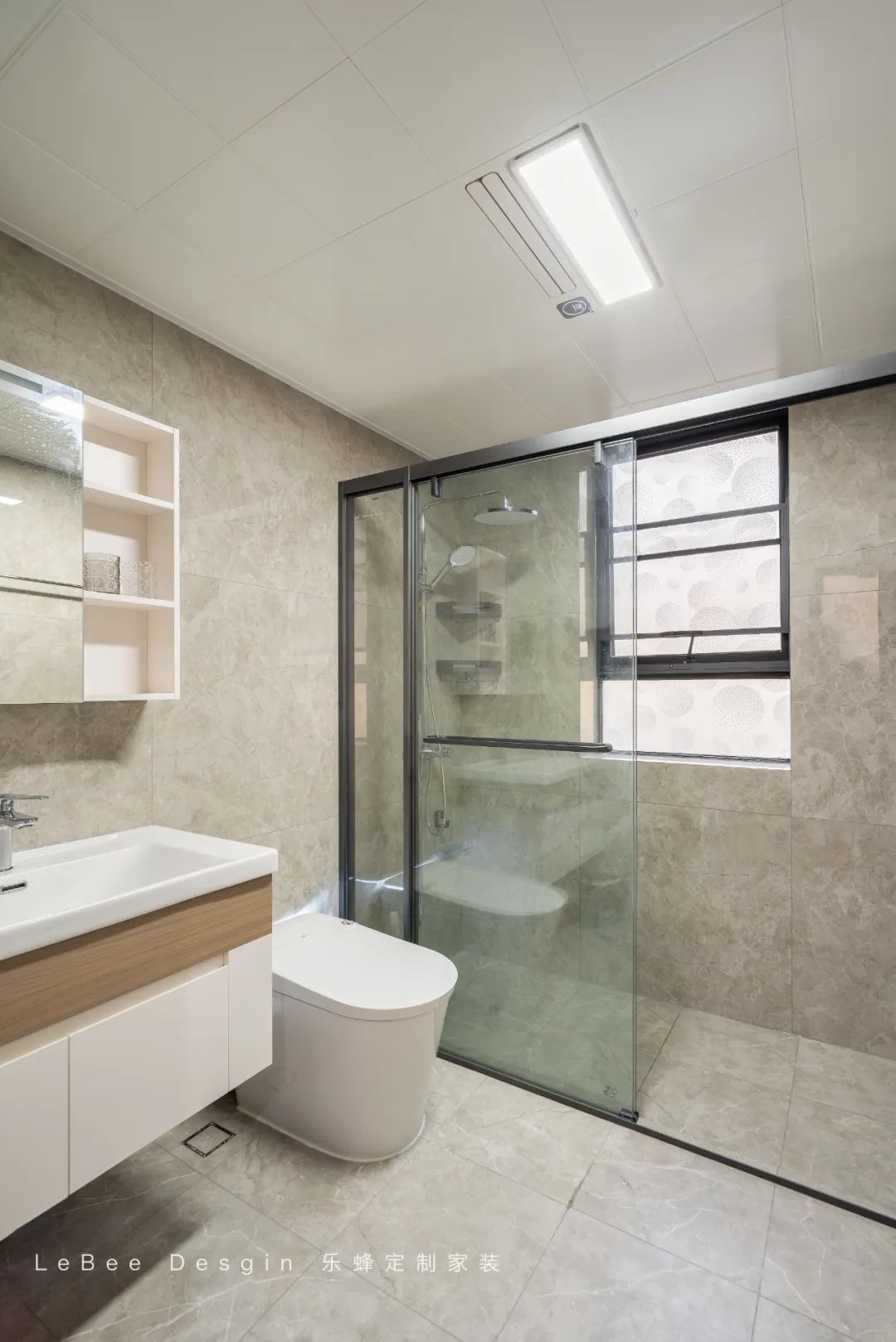 公衛(wèi)三分離設(shè)計,淋浴區(qū)定制置物架收納洗浴用品;洗手臺外移,高峰期使用互不干擾。