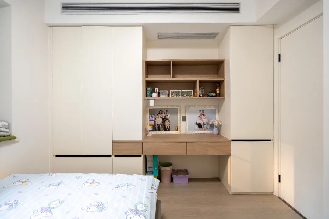 衣柜內(nèi)嵌,推拉門內(nèi)層板可調(diào),適應(yīng)不同年齡段。預(yù)留活動區(qū)釋放孩子天性。從玩耍到學(xué)習(xí),這里既是私密天地,也是成長港灣。