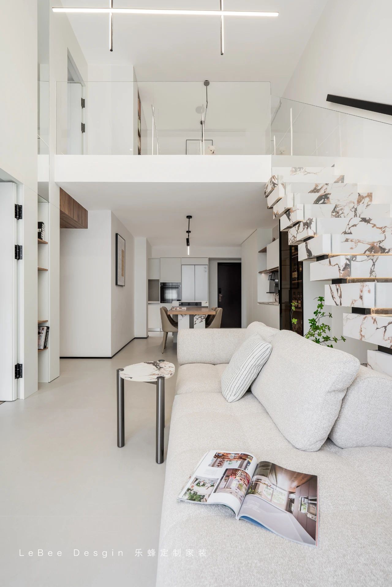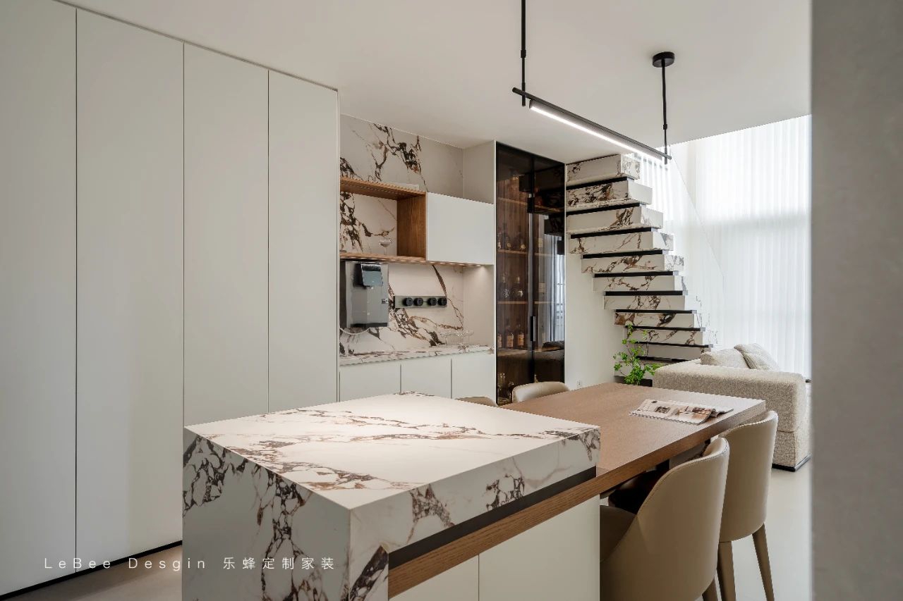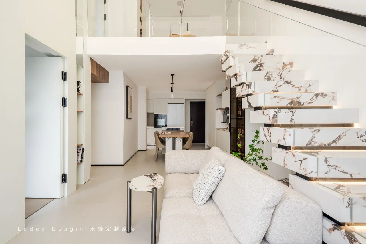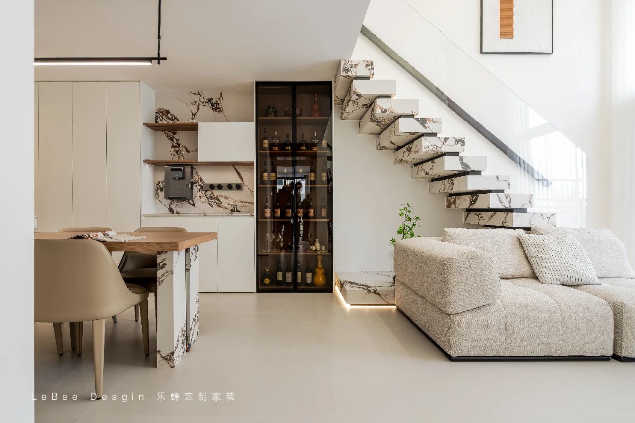 羅湖蓮塘的靜謐綠洲——合正錦園,一套150㎡復(fù)式空間以現(xiàn)代簡約風(fēng)煥發(fā)新生。 設(shè)計師通過極簡線條、天然材質(zhì)與光影互動,將層高優(yōu)勢與功能需求完美結(jié)合,打造出既開放又私密、既實用又充滿藝術(shù)感的都市居所。 清晨陽光穿透落地窗灑在亞麻窗簾上的光影、懸浮樓梯踏步亮起的暖黃燈帶、島臺咖啡機(jī)啟動時的低鳴,共同構(gòu)建出快節(jié)奏都市中獨有的慢生活儀式感。