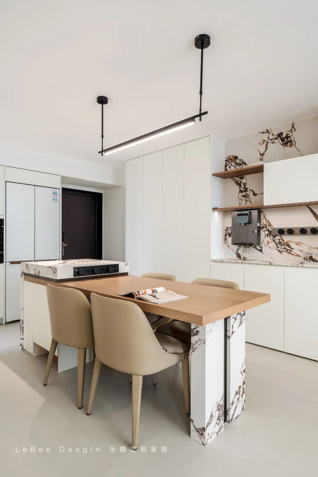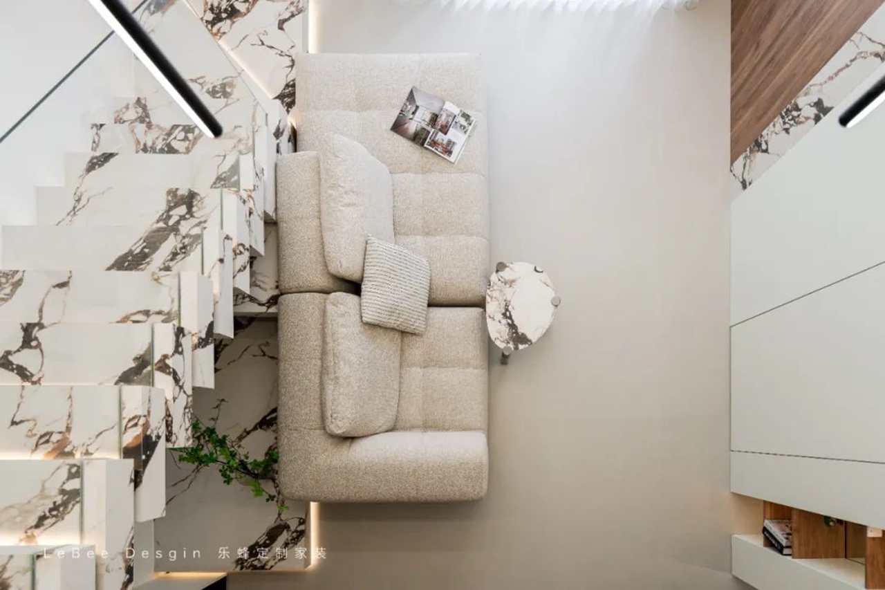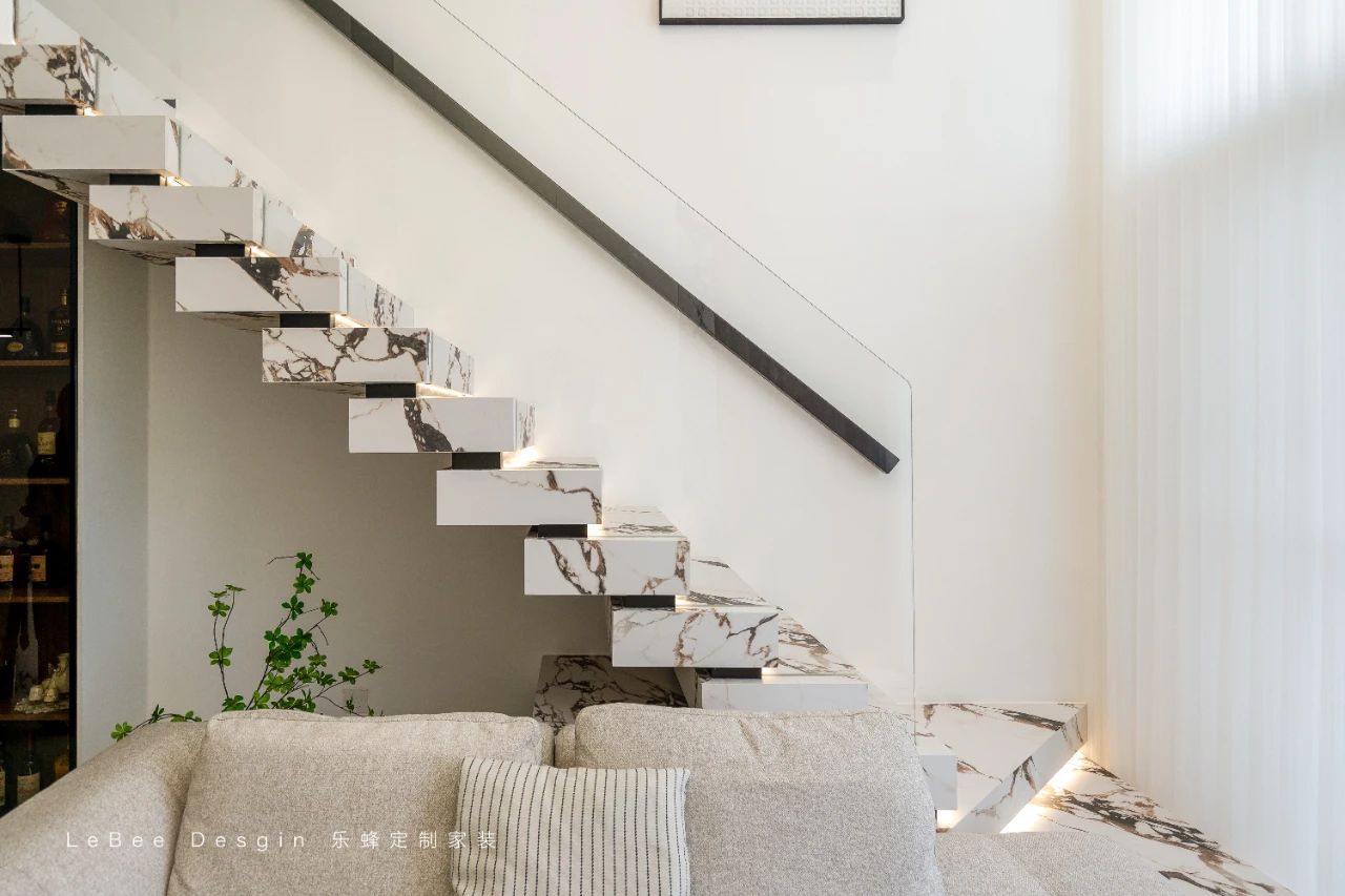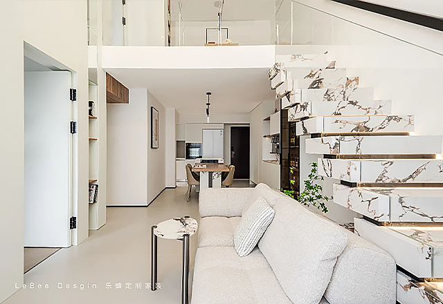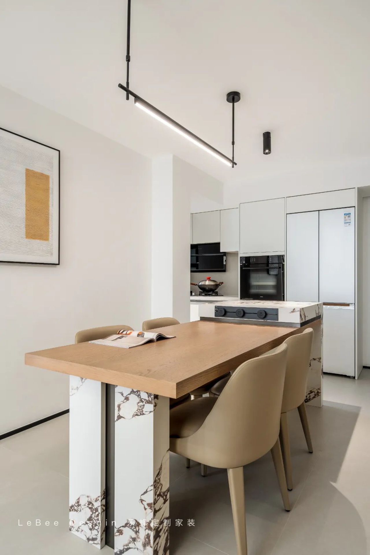 羅湖蓮塘的靜謐綠洲——合正錦園,一套150㎡復(fù)式空間以現(xiàn)代簡約風(fēng)煥發(fā)新生。 設(shè)計師通過極簡線條、天然材質(zhì)與光影互動,將層高優(yōu)勢與功能需求完美結(jié)合,打造出既開放又私密、既實用又充滿藝術(shù)感的都市居所。 清晨陽光穿透落地窗灑在亞麻窗簾上的光影、懸浮樓梯踏步亮起的暖黃燈帶、島臺咖啡機(jī)啟動時的低鳴,共同構(gòu)建出快節(jié)奏都市中獨有的慢生活儀式感。
