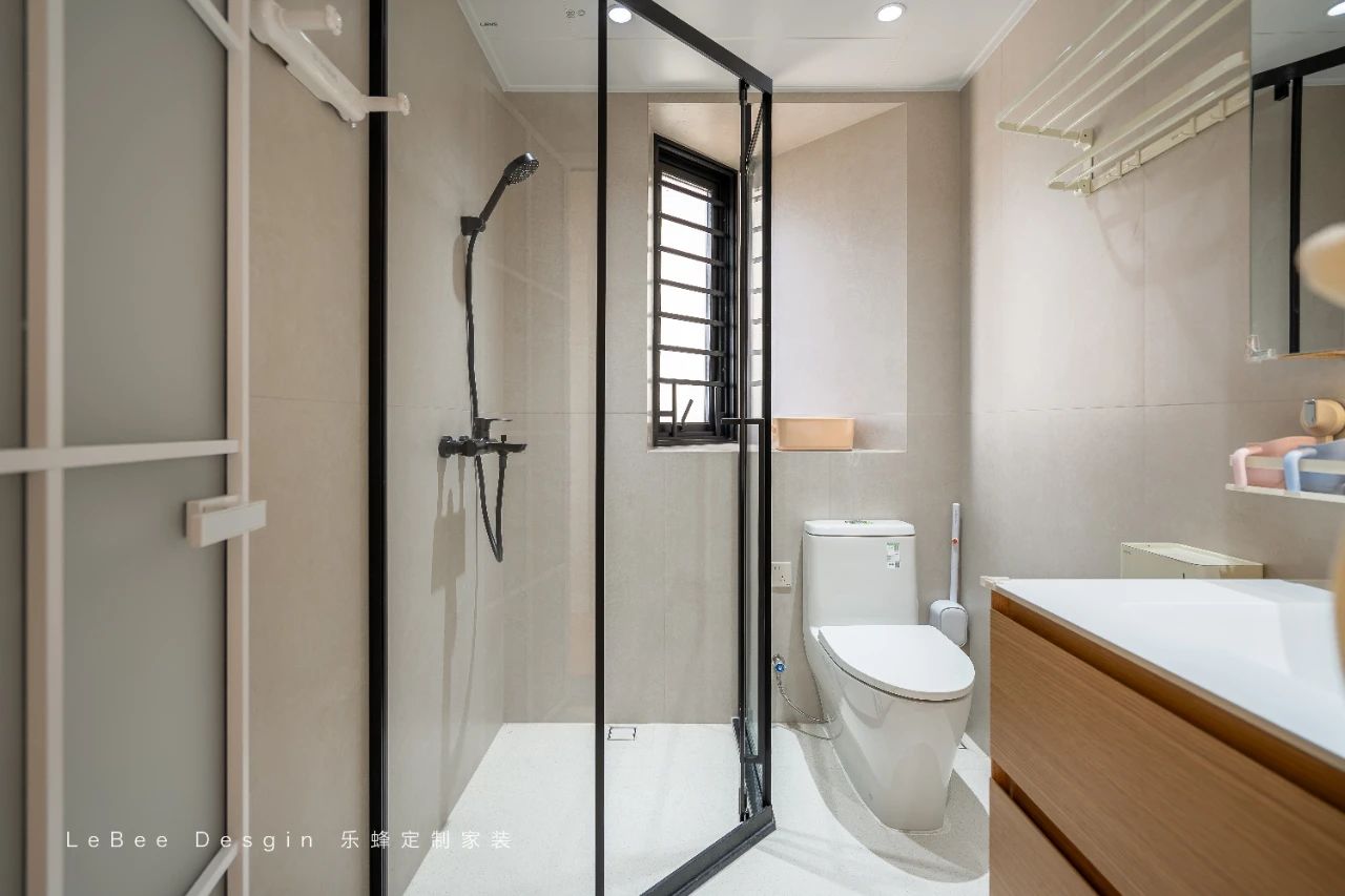 公衛(wèi)鉆石型淋濕分離淋浴房通高玻璃隔斷預(yù)埋U型導(dǎo)水槽,懸浮浴室柜延伸至馬桶區(qū),鏡柜集成防霧燈帶+側(cè)邊開放格。