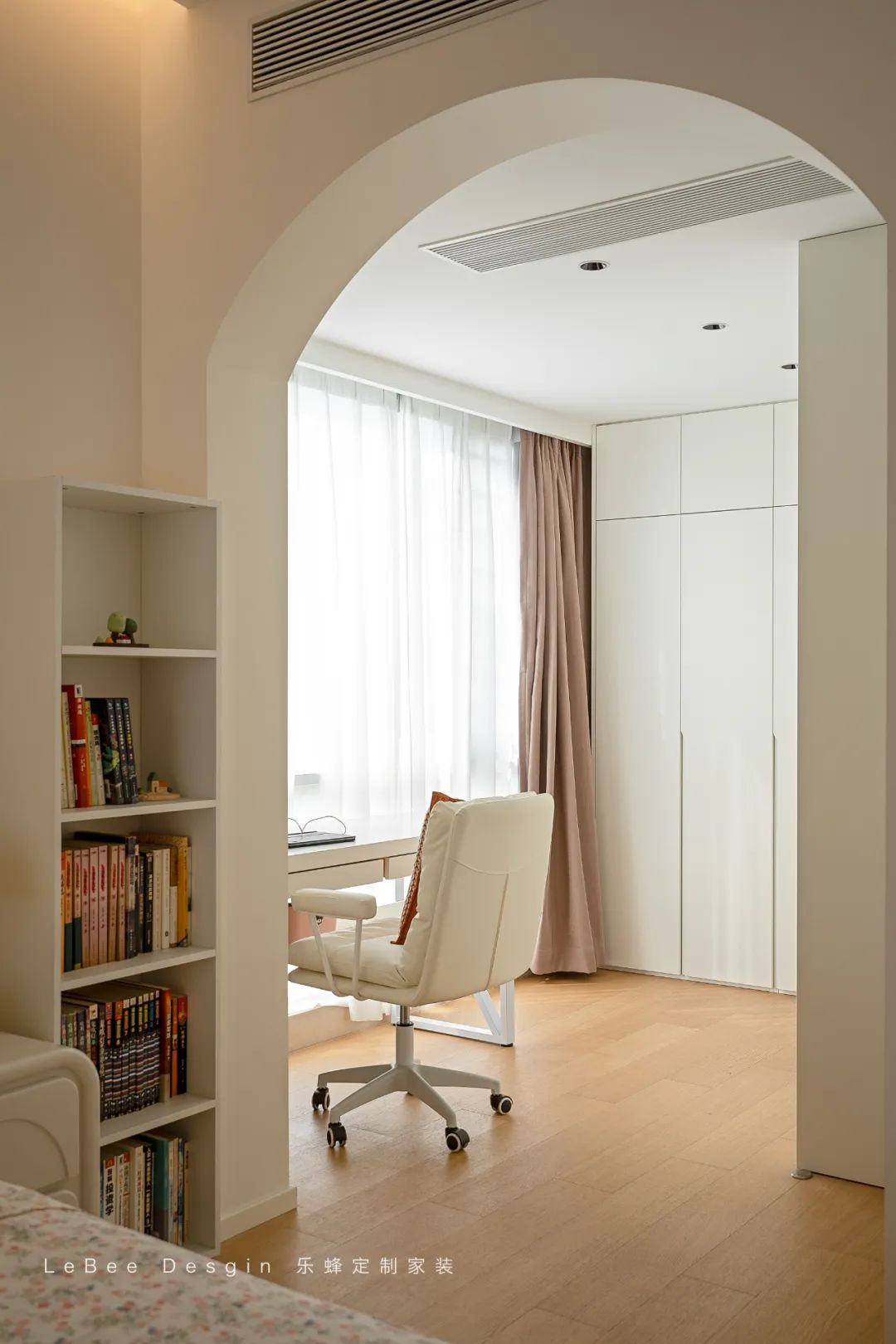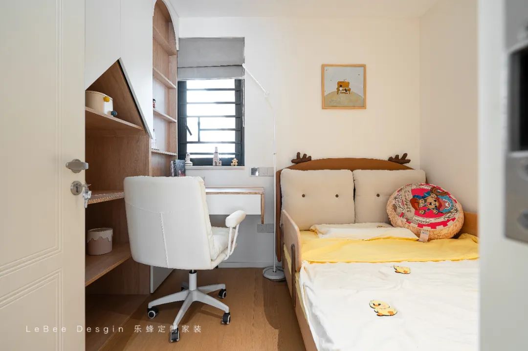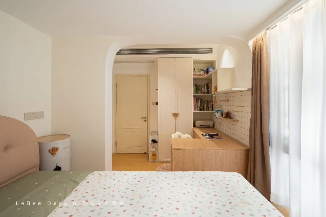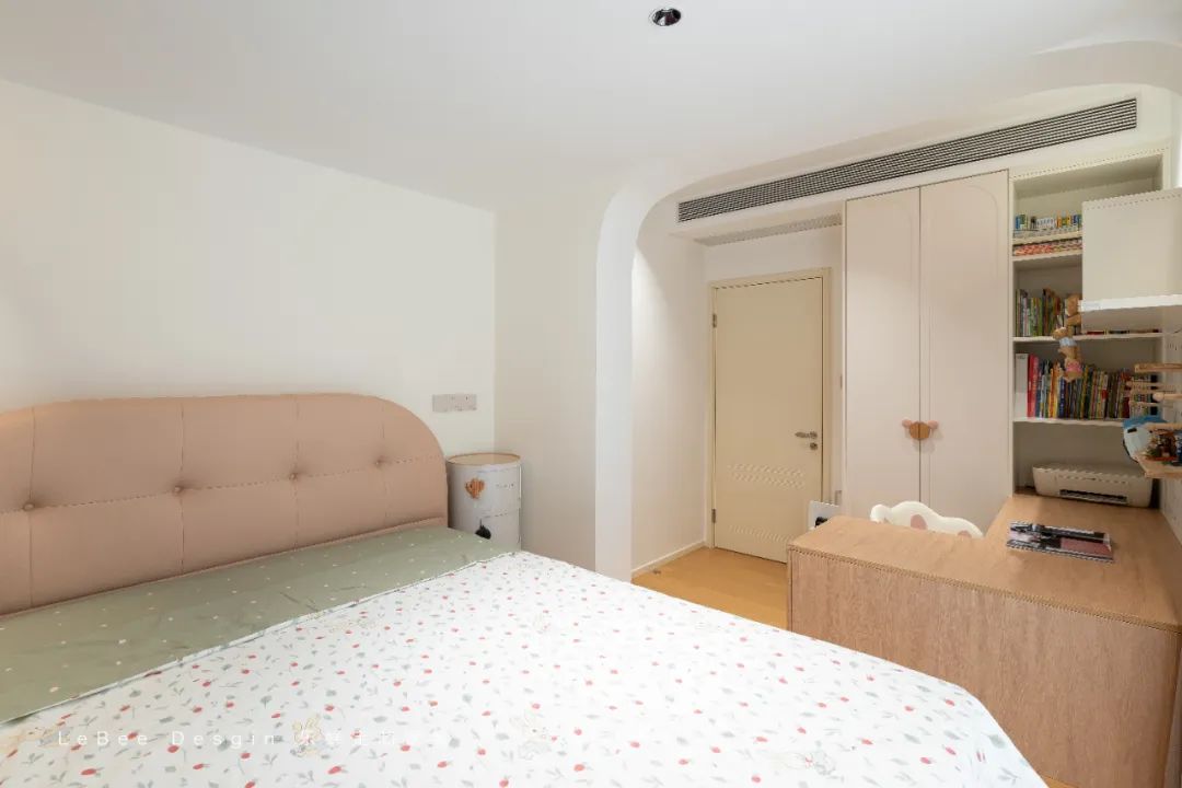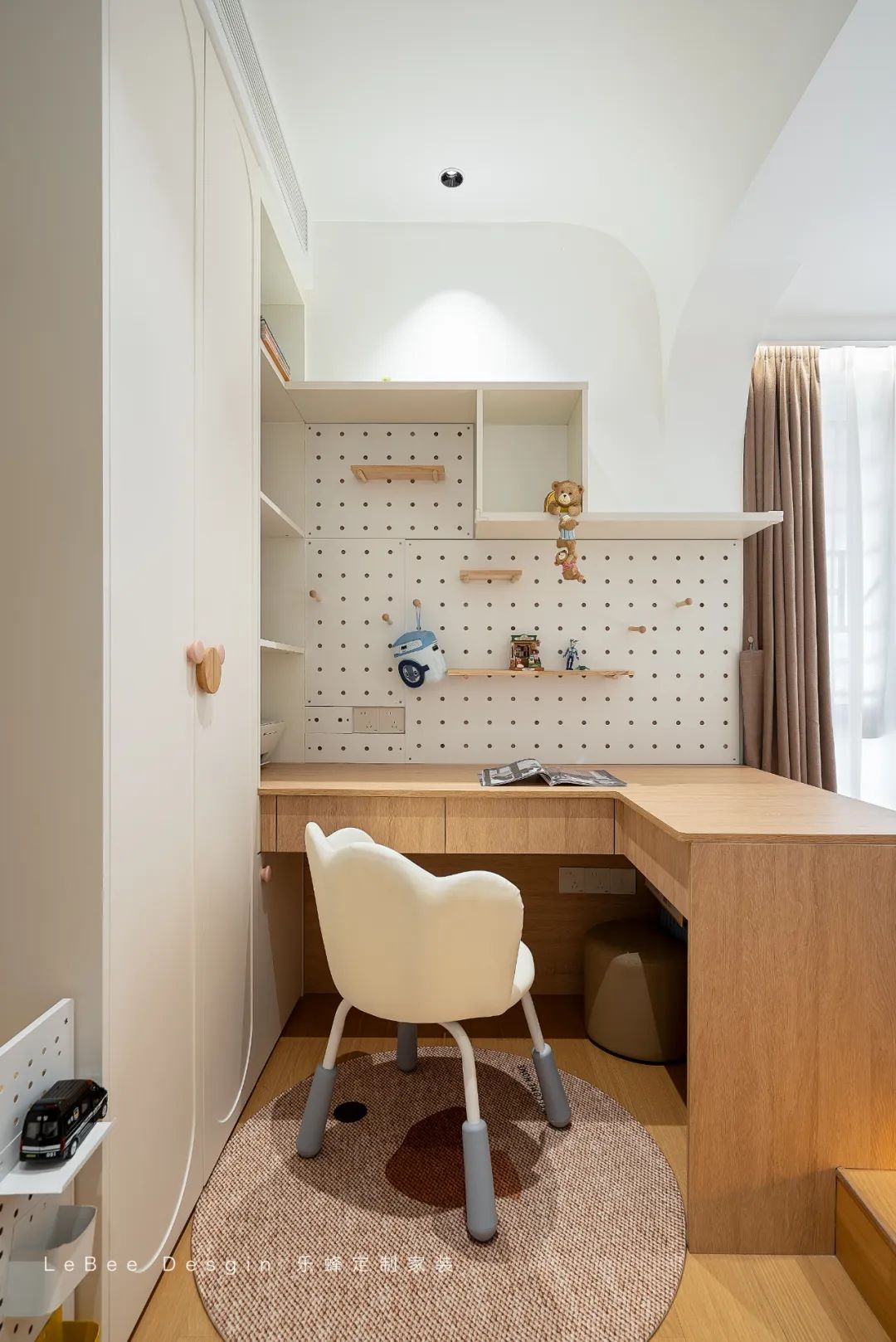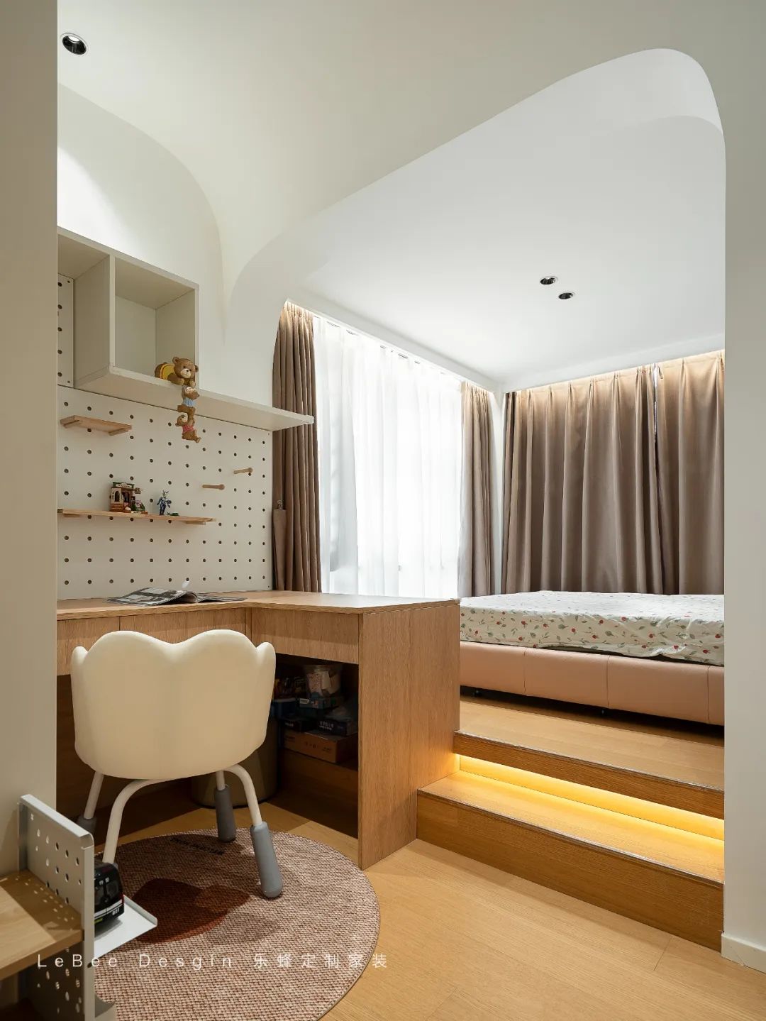女孩房以低飽奶油色融入原木基調(diào),定制榻榻米床箱延伸懸浮書桌使得整個空間更加溫馨。