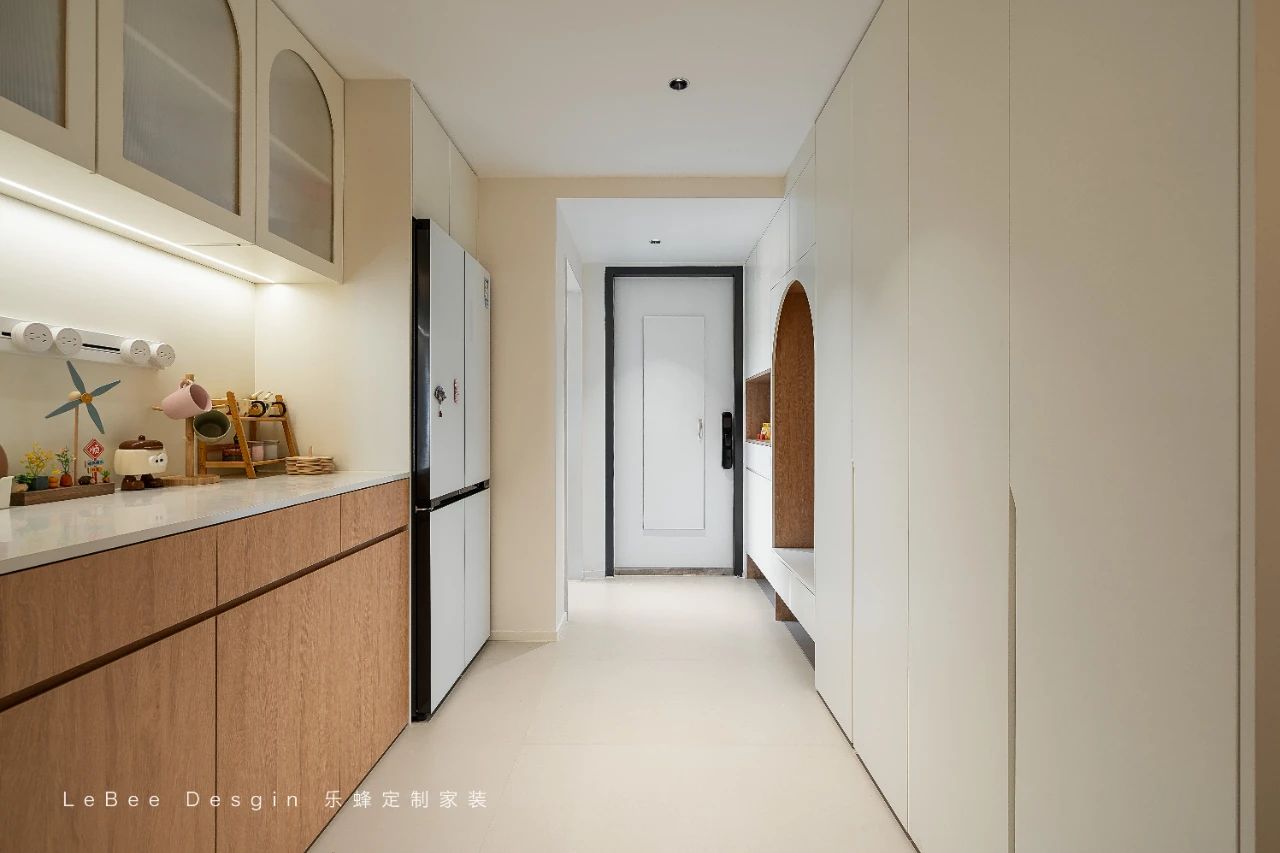入戶左手邊定制通頂柜體,中部鏤空嵌入暖光燈帶,滿足隨手置物需求;右側(cè)弧形換鞋凳與懸浮柜組合,柔化直角銳利感,搭配木格柵點綴,營造歸家儀式感。
