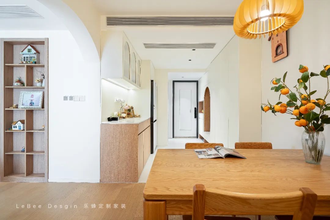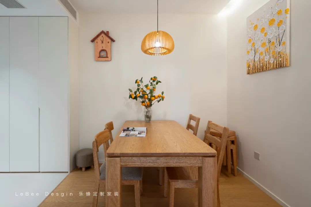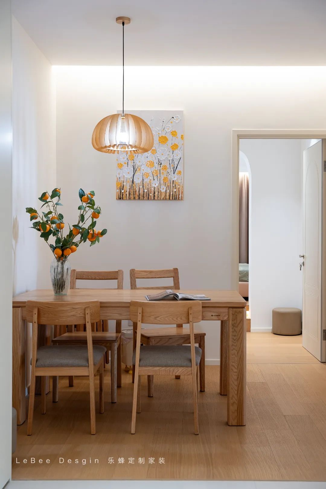 餐廳延續(xù)整體的原木奶油風(fēng),木色餐桌搭配簡約餐椅,營造出自然質(zhì)樸的用餐氛圍。墻面掛著幾幅藝術(shù)裝飾畫,增添了藝術(shù)氣息。