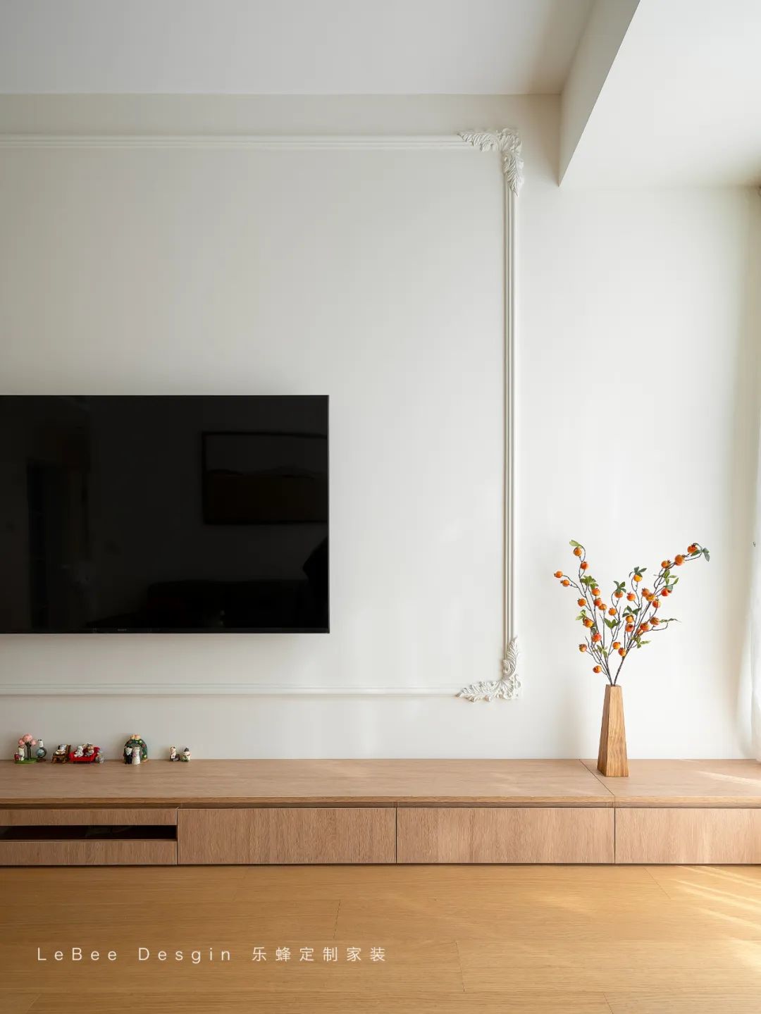 下方搭配的原木地柜,則延續(xù)了全屋的自然基調(diào),溫潤的木質(zhì)紋理與法式線條形成剛?cè)岵囊曈X效果。