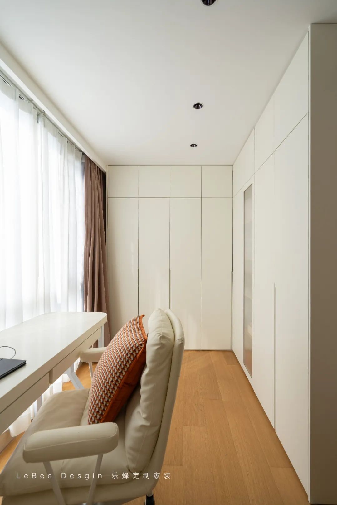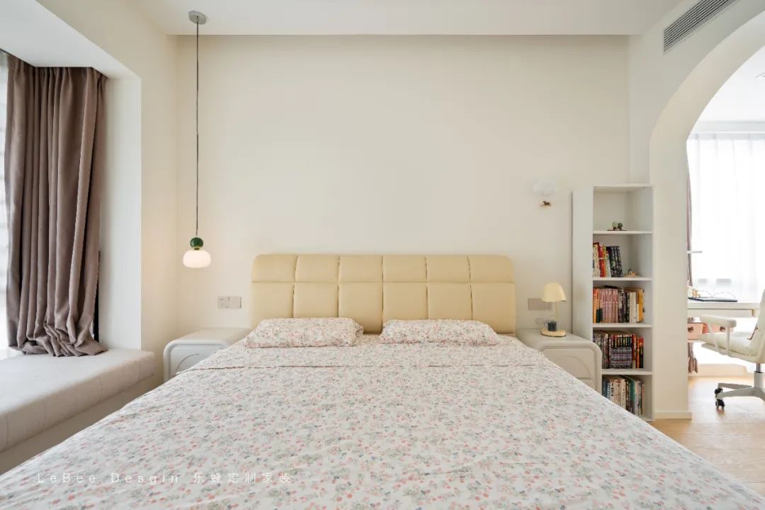 主臥延續(xù)原木奶油基調(diào),通鋪橡木人字拼地板串聯(lián)睡眠區(qū)、辦公區(qū)與衣帽間。