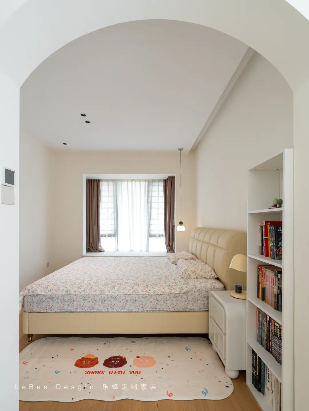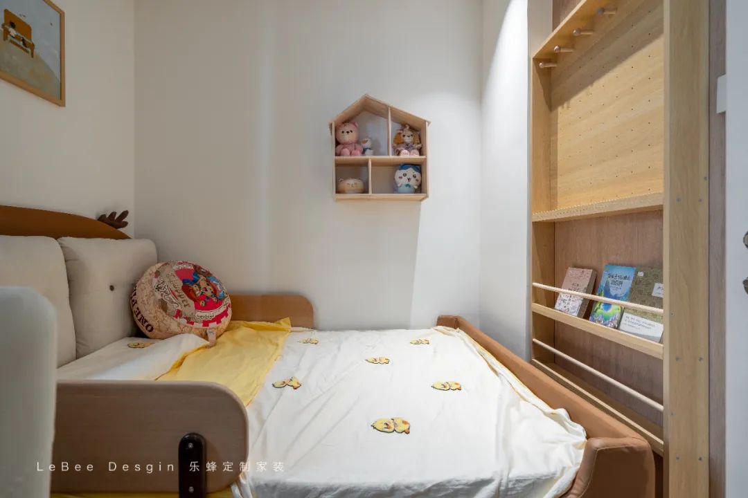 兒童房采用L型半包圍榻榻米定制,地臺底部三大抽屜收納過季衣物與被褥,側(cè)邊延伸懸浮書桌銜接開放格書架,實現(xiàn)“睡眠+學(xué)習(xí)+儲物”三位一體。