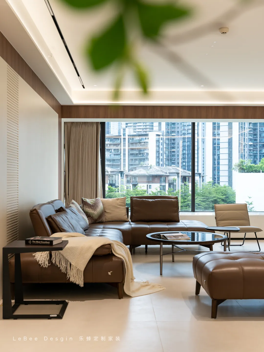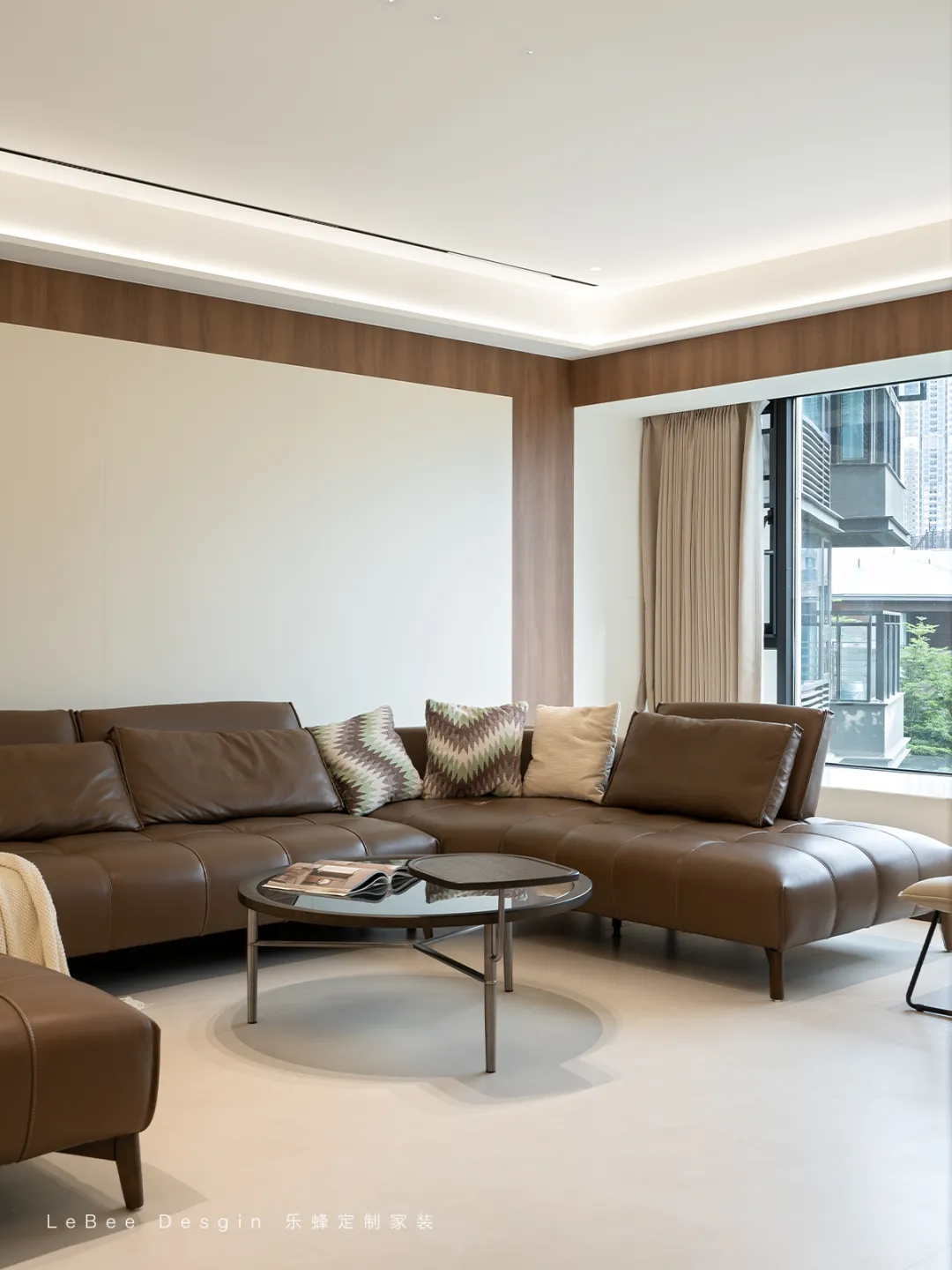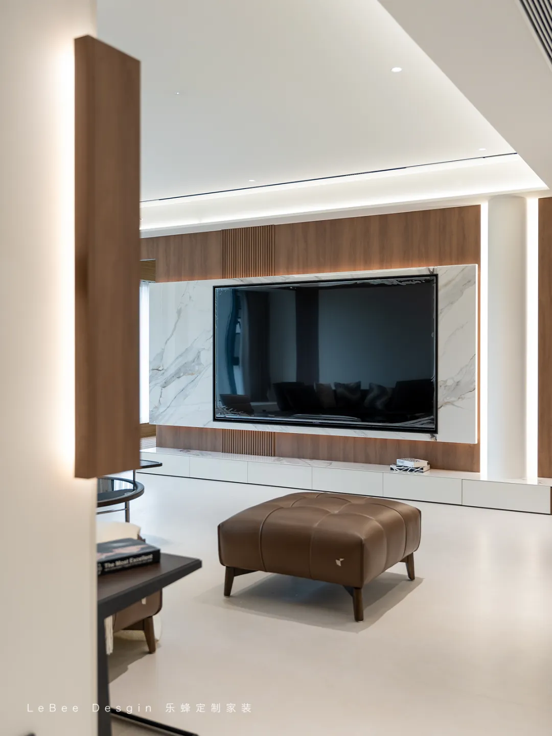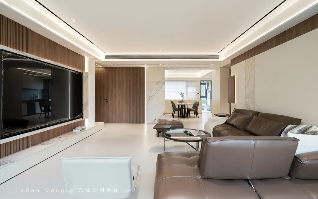 客廳采用現(xiàn)代簡約與輕奢風格的融合,以胡桃木飾面板的溫暖質(zhì)感搭配白色大理石巖板的高級感,再結(jié)合棕色真皮沙發(fā),在視覺和觸覺上都營造出高品質(zhì)的氛圍。