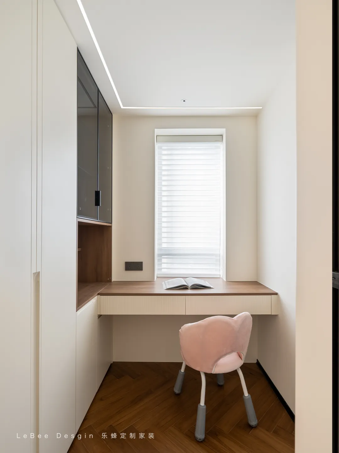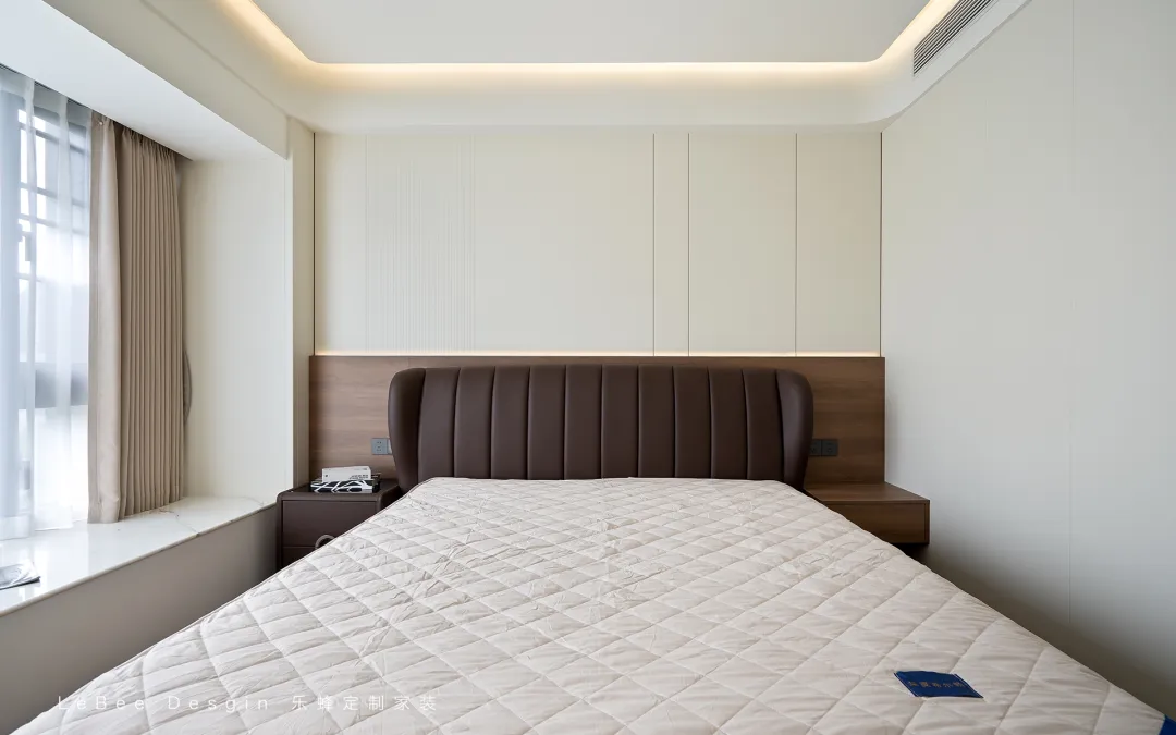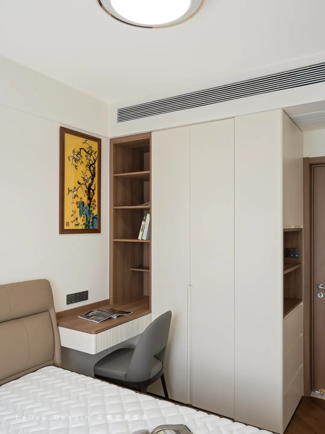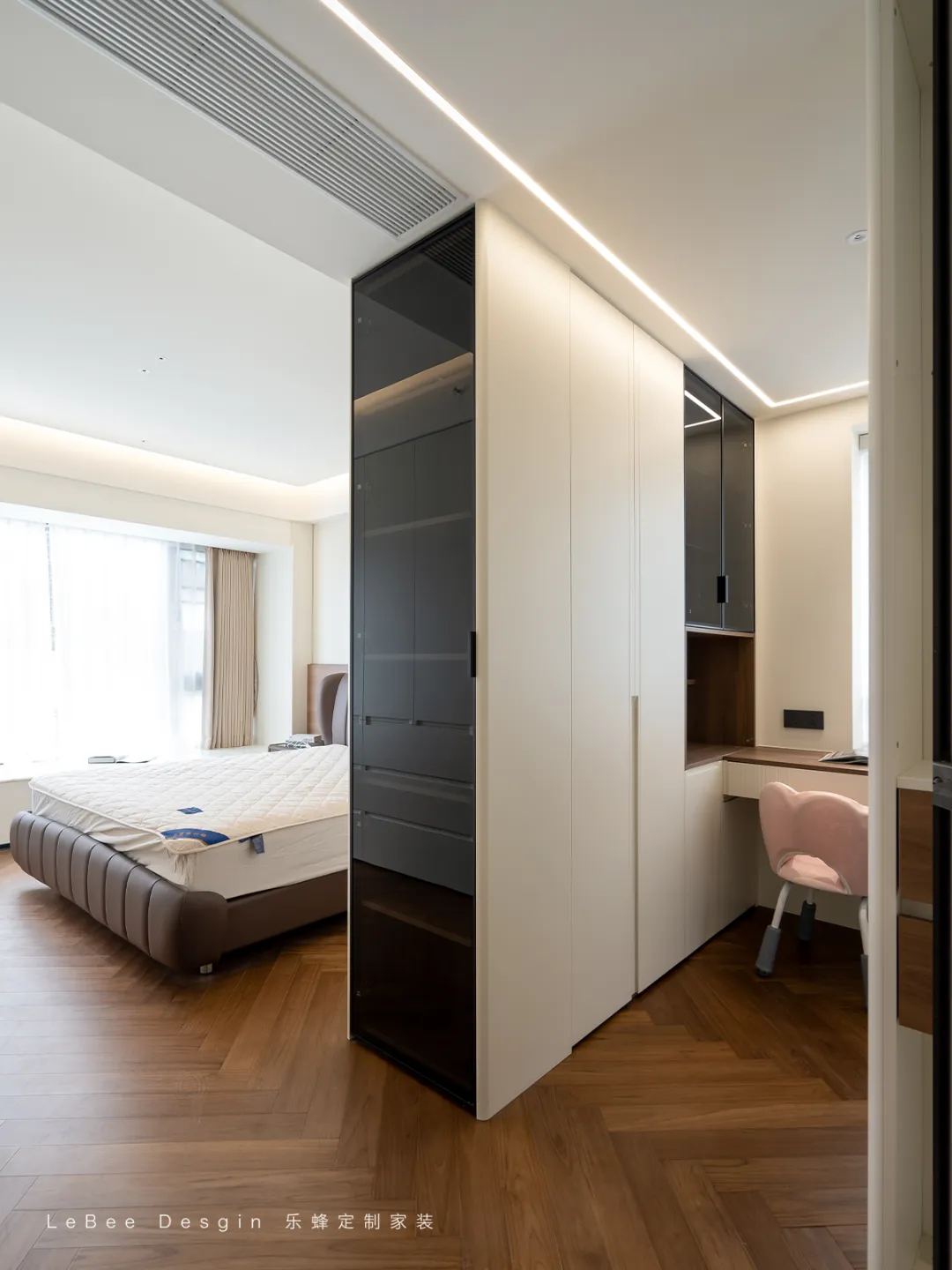 主臥延續(xù)了全屋現(xiàn)代簡約的風格,以米白色定制柜體為主,搭配胡桃木色的開放格和人字拼木地板,在色調(diào)上形成溫暖且高級的質(zhì)感對比。
