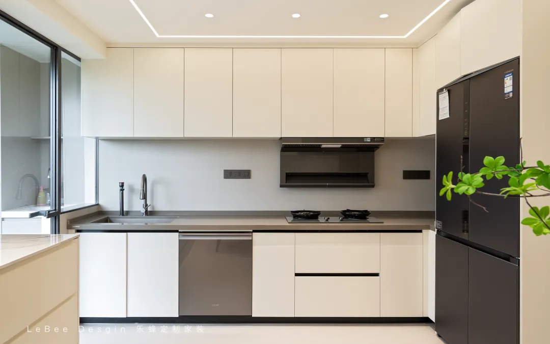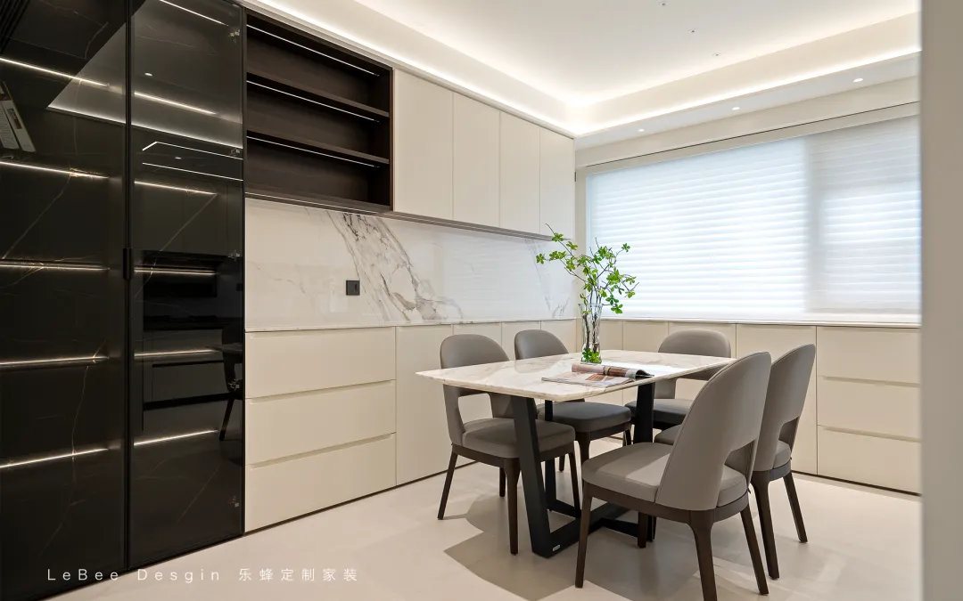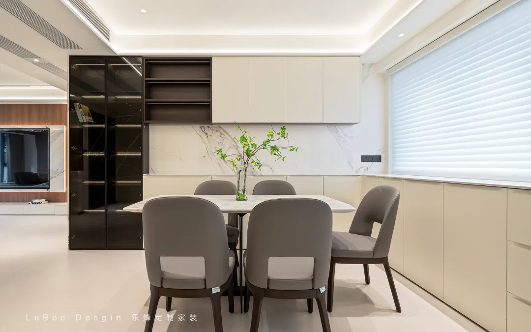 設(shè)計了一體化餐邊柜 + 收納系統(tǒng),米白色櫥柜提供充足儲物空間,上方的開放式深色格架可擺放裝飾品或餐具
