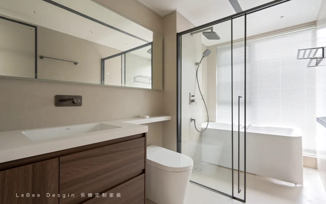 巧妙融合采用‘’干濕分離 + 浴缸整合‘’ 的布局 ,通過黑色金屬邊框的玻璃隔斷,將淋浴區(qū)與浴缸整合為一個功能區(qū)。