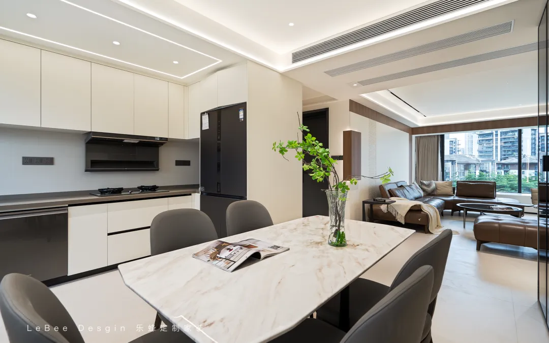采用開放式布局,與廚房、客廳自然銜接,增強了空間的通透感和互動性。