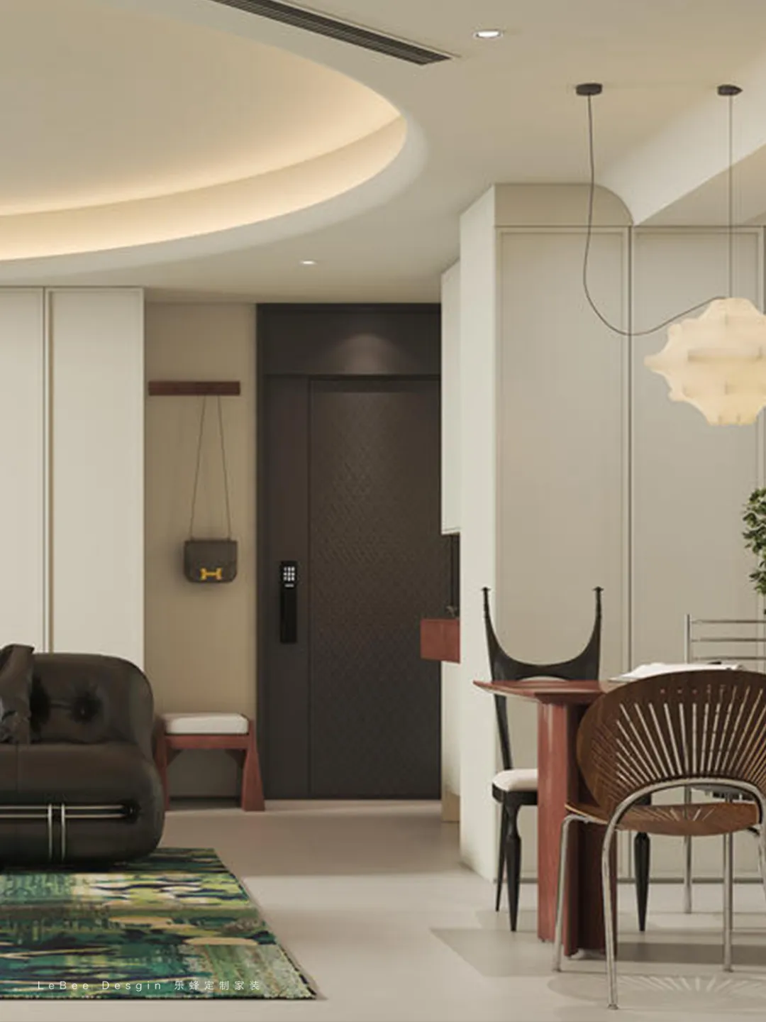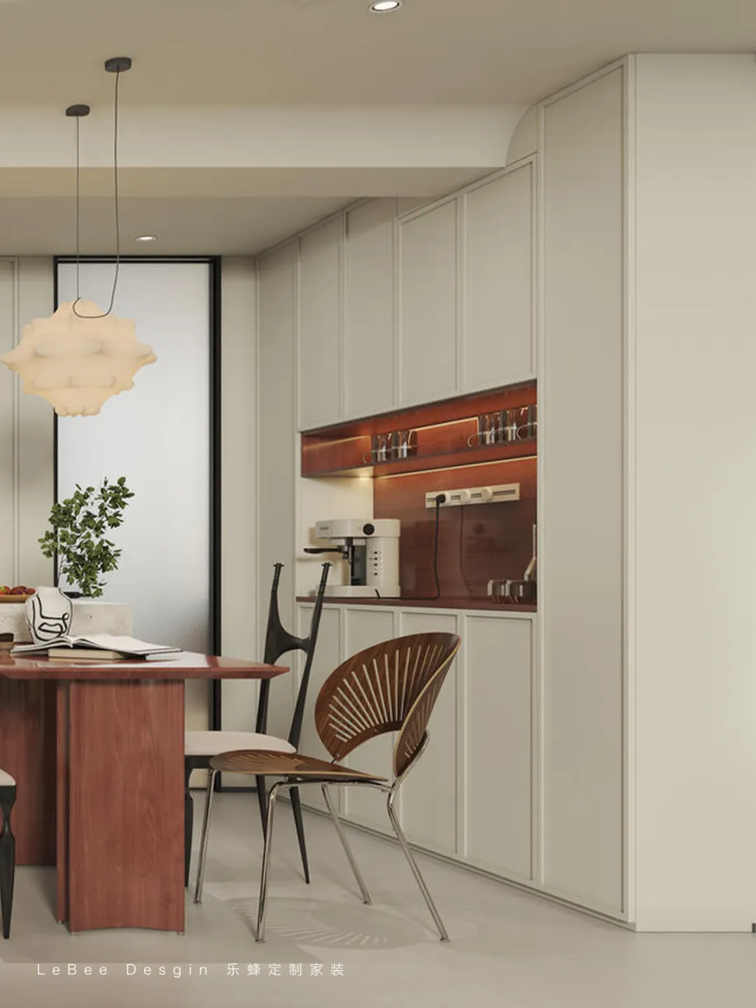 餐廳吊頂、柜體邊角等融入弧形設(shè)計(jì),柔化空間線條,呼應(yīng)奶油風(fēng)的柔潤(rùn)特質(zhì),讓餐廚區(qū)域更具藝術(shù)感。
