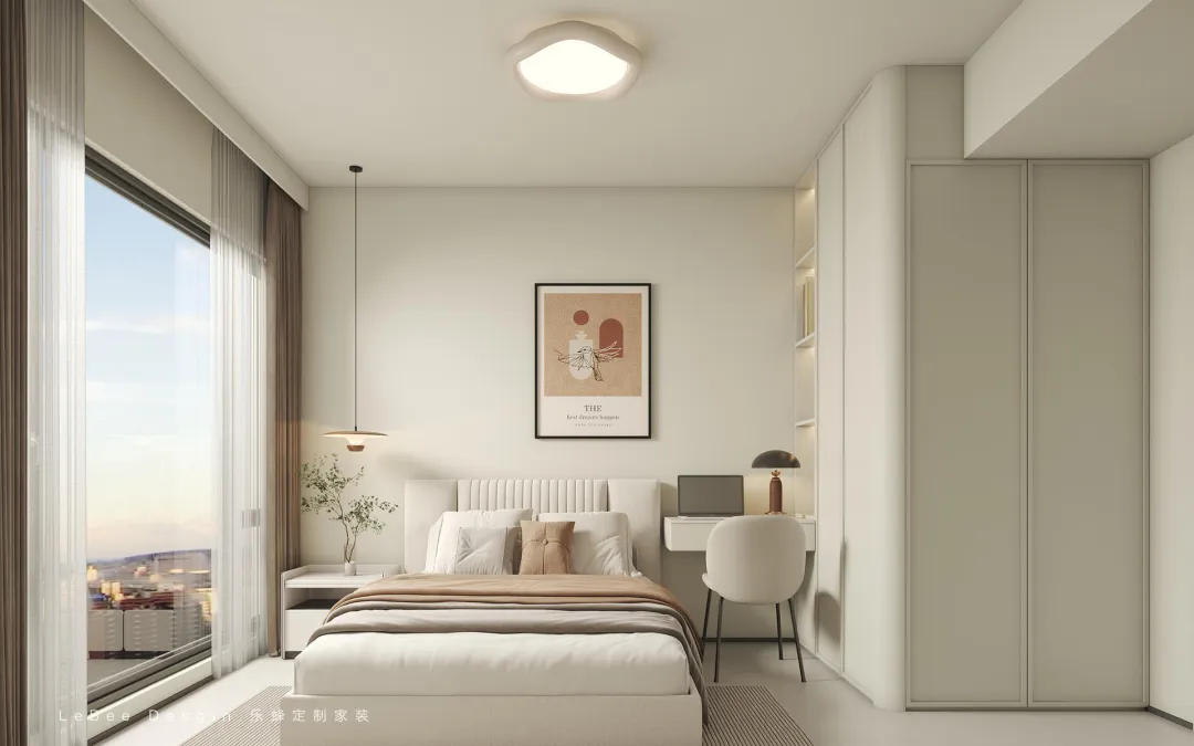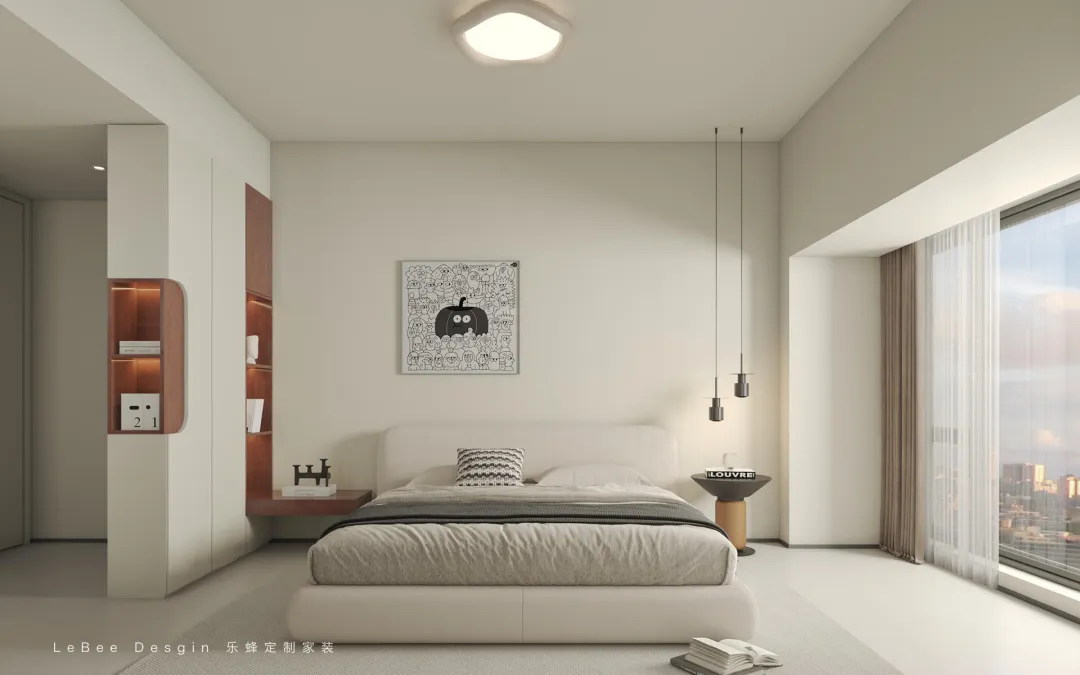 以奶油色系奠定柔和治愈的基調(diào),搭配深木色收納區(qū)和灰色床品形成色彩層次,定制柜體采用 “封閉 + 開放” 設(shè)計(jì),既滿足收納需求,又成為空間的裝飾亮點(diǎn)。