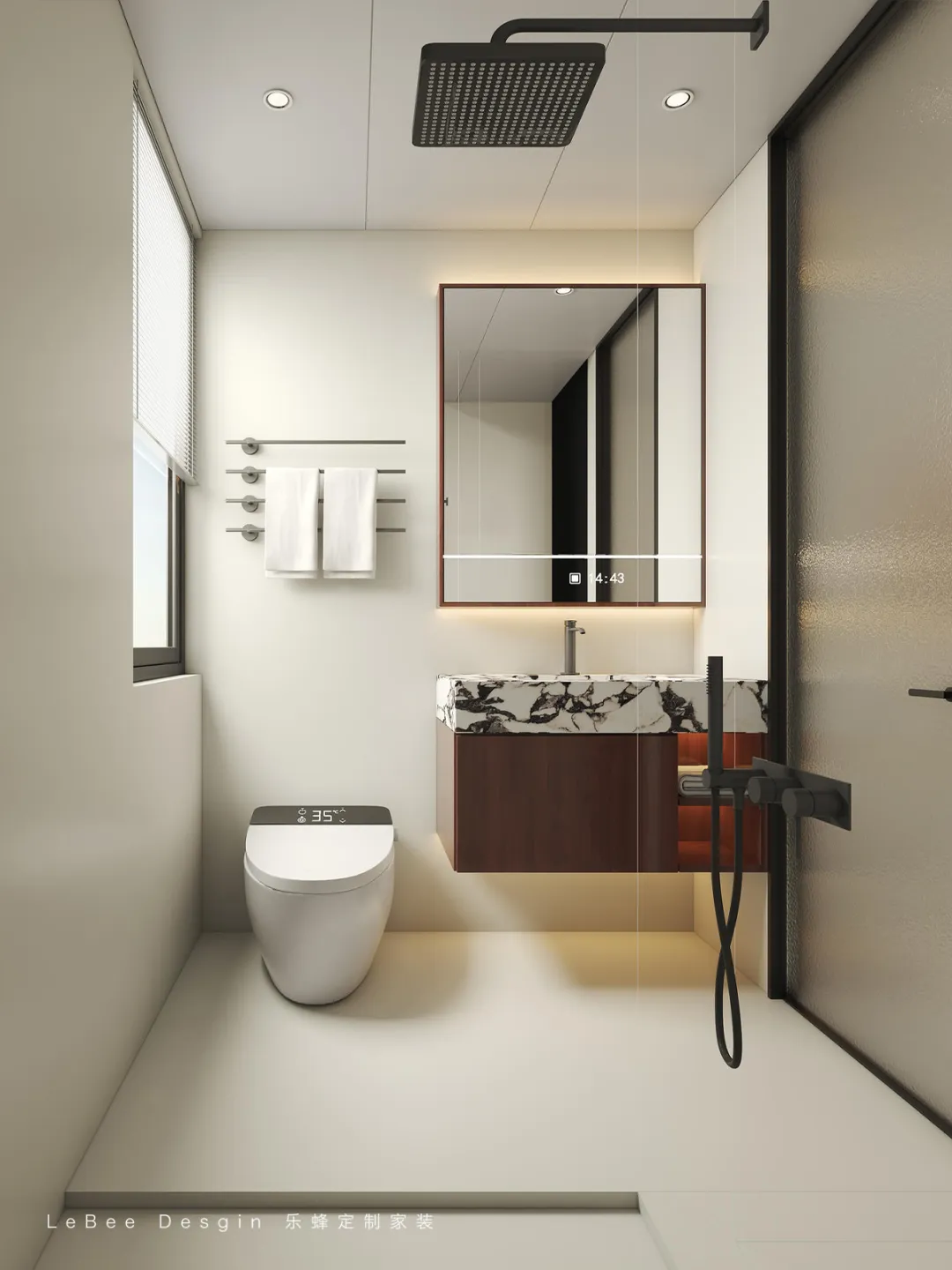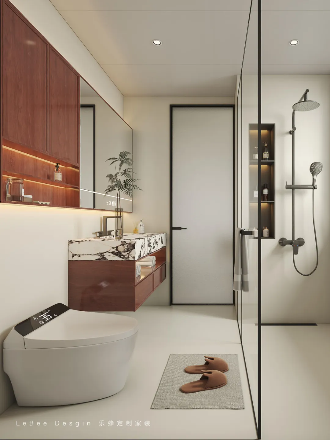 通過玻璃隔斷實(shí)現(xiàn)淋浴區(qū)與干區(qū)的物理分隔,保持空間干爽的同時(shí),提升了使用效率。