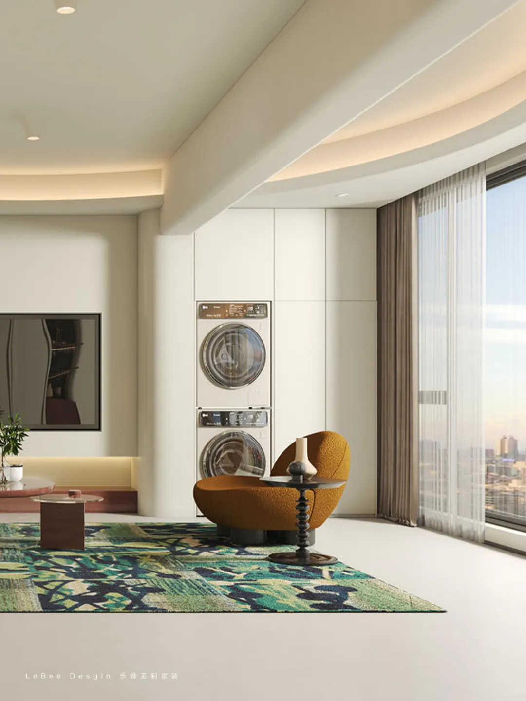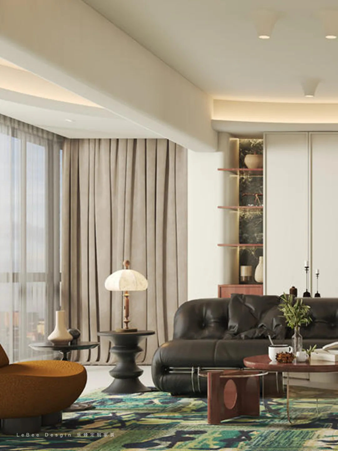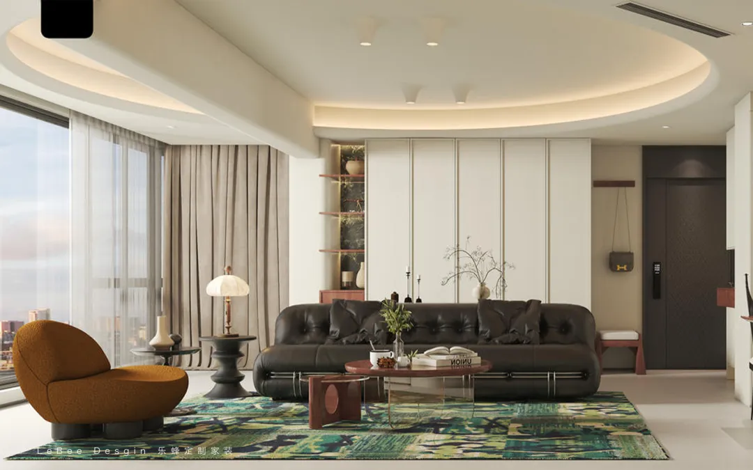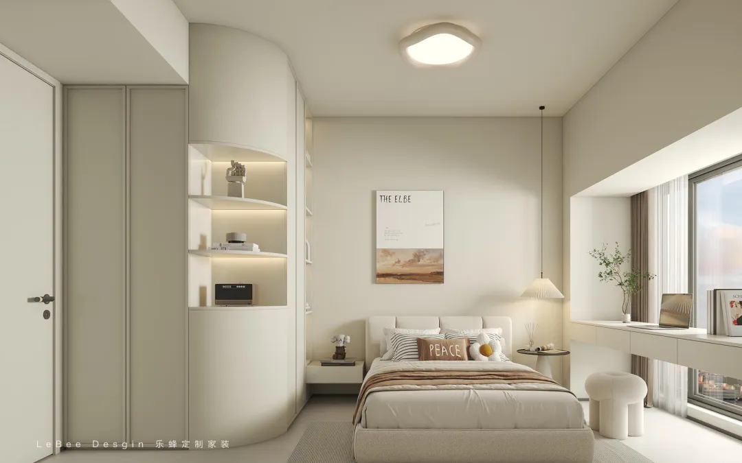 實(shí)現(xiàn) “睡眠 + 收納 + 休閑辦公” 的功能整合。左側(cè)弧形展示柜可陳列擺件、書籍,兼具收納與裝飾。