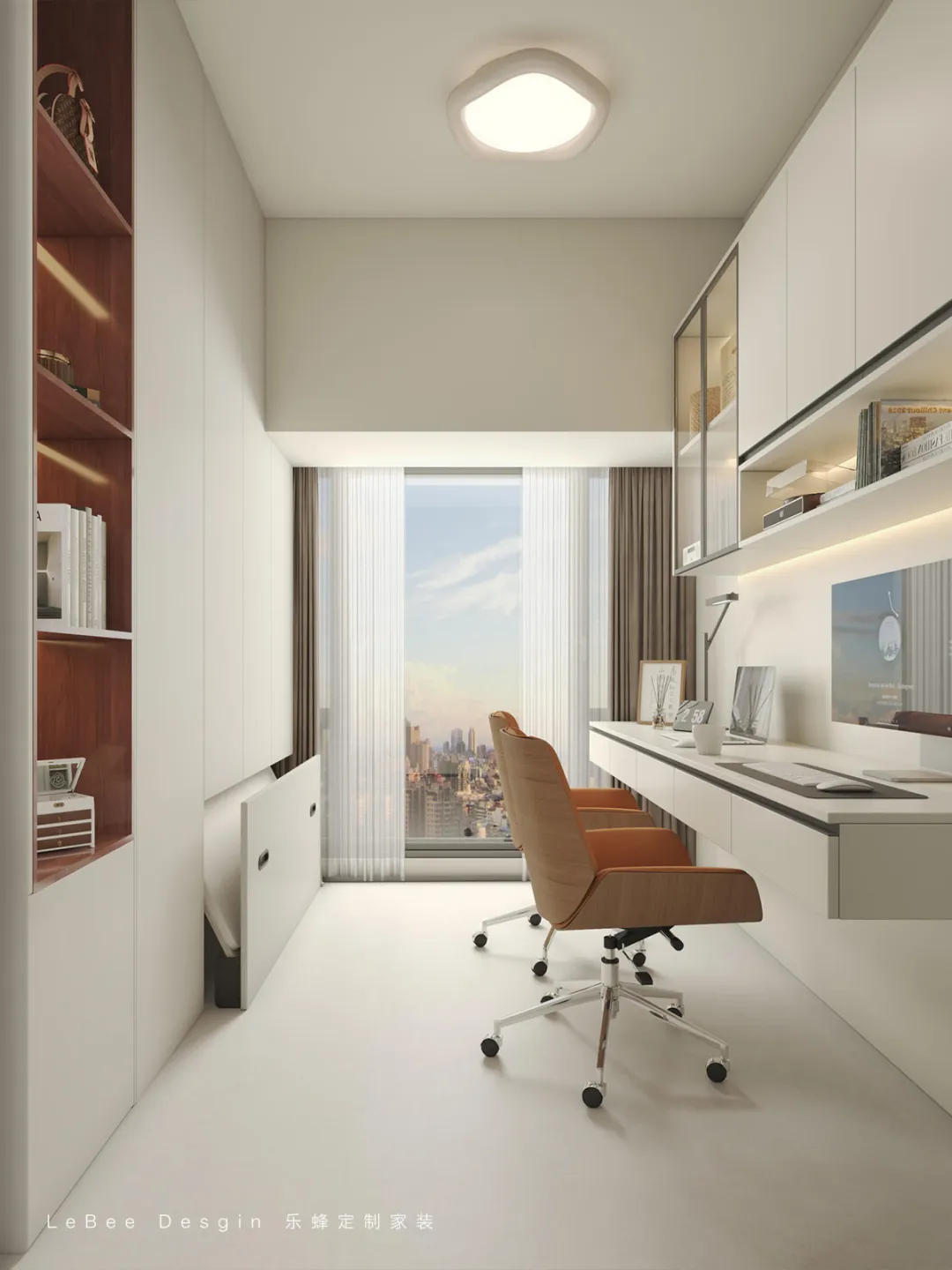 一側(cè)是長(zhǎng)形辦公區(qū),滿足雙人同時(shí)辦公;另一側(cè)隱藏式折疊床設(shè)計(jì),可作為客臥使用,最大化利用空間。