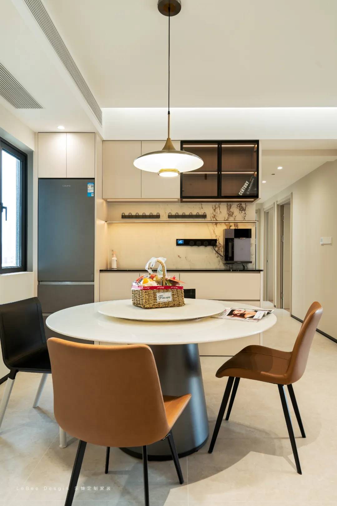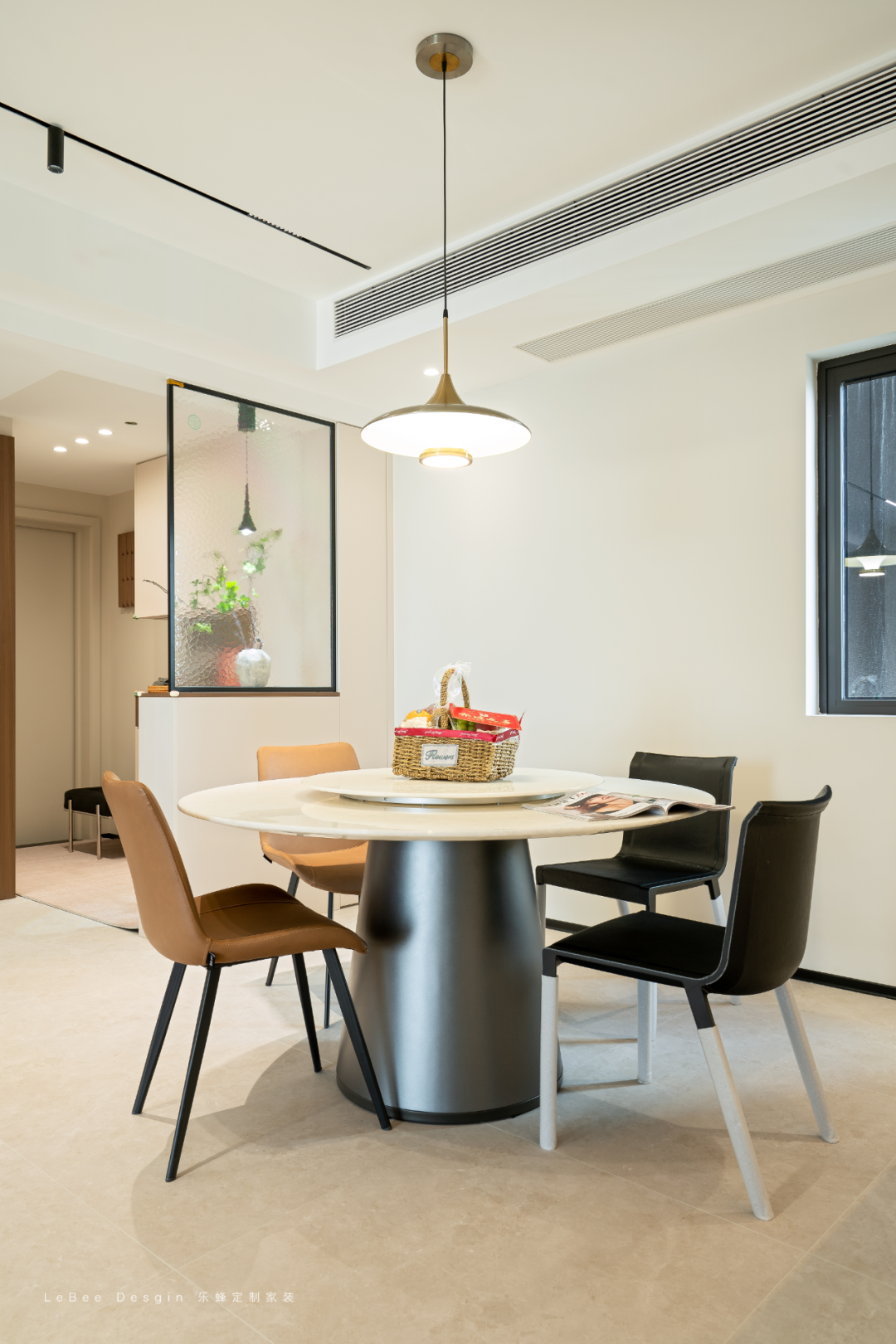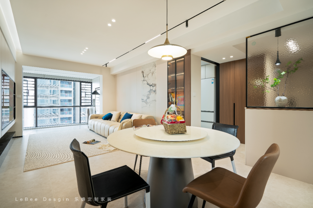 餐桌選圓形巖板桌 + 金屬圓柱底座,圓形更適配開放空間的動(dòng)線(避免磕碰),巖板材質(zhì)耐臟好打理,金屬底座則增加了現(xiàn)代感。