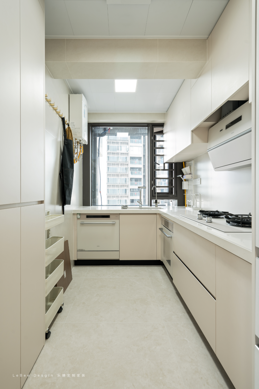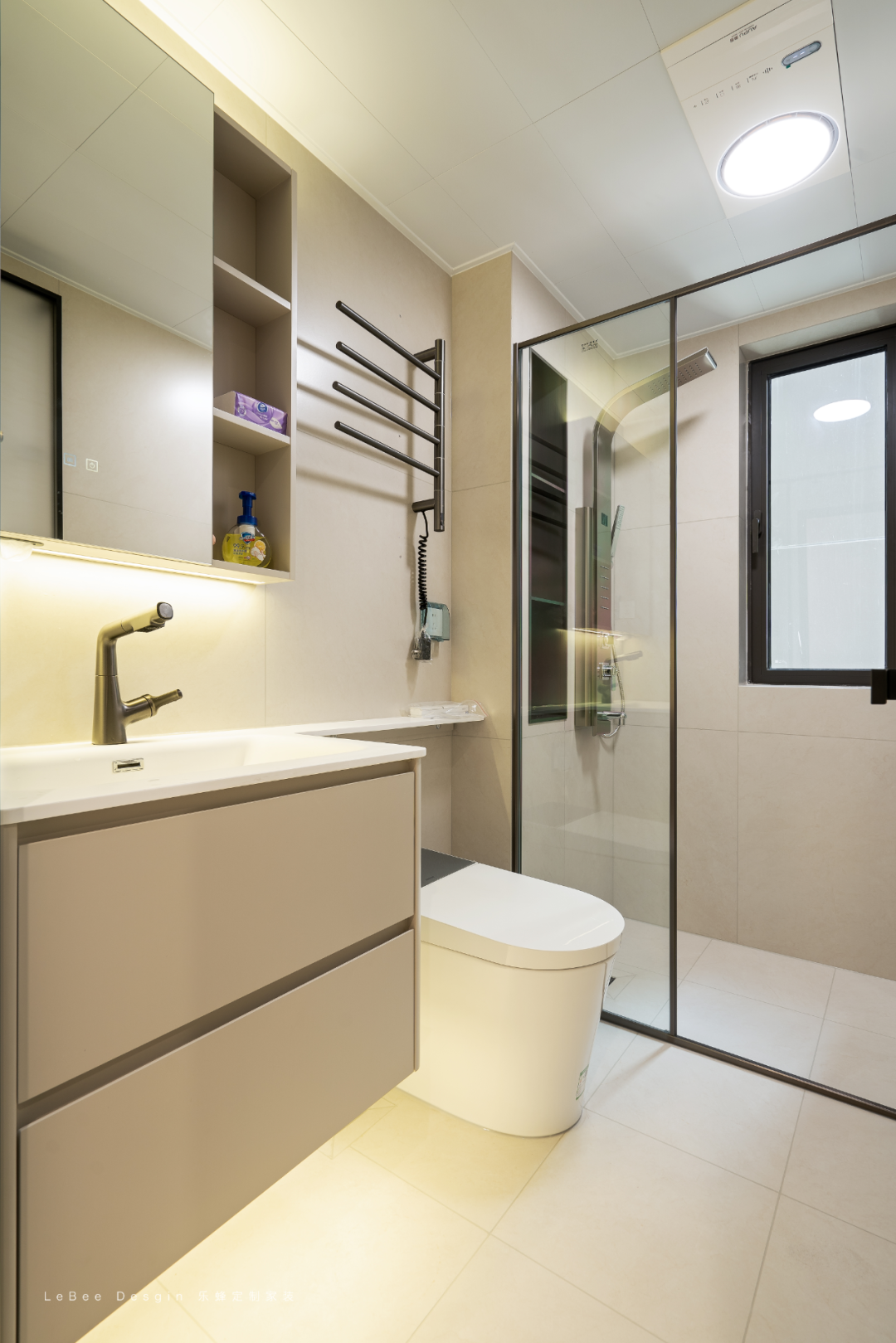 主色調(diào)選了低飽和淺米色 + 白色,搭配柔和的淺灰色地磚、淺麻色地毯,整體氛圍清爽治愈。