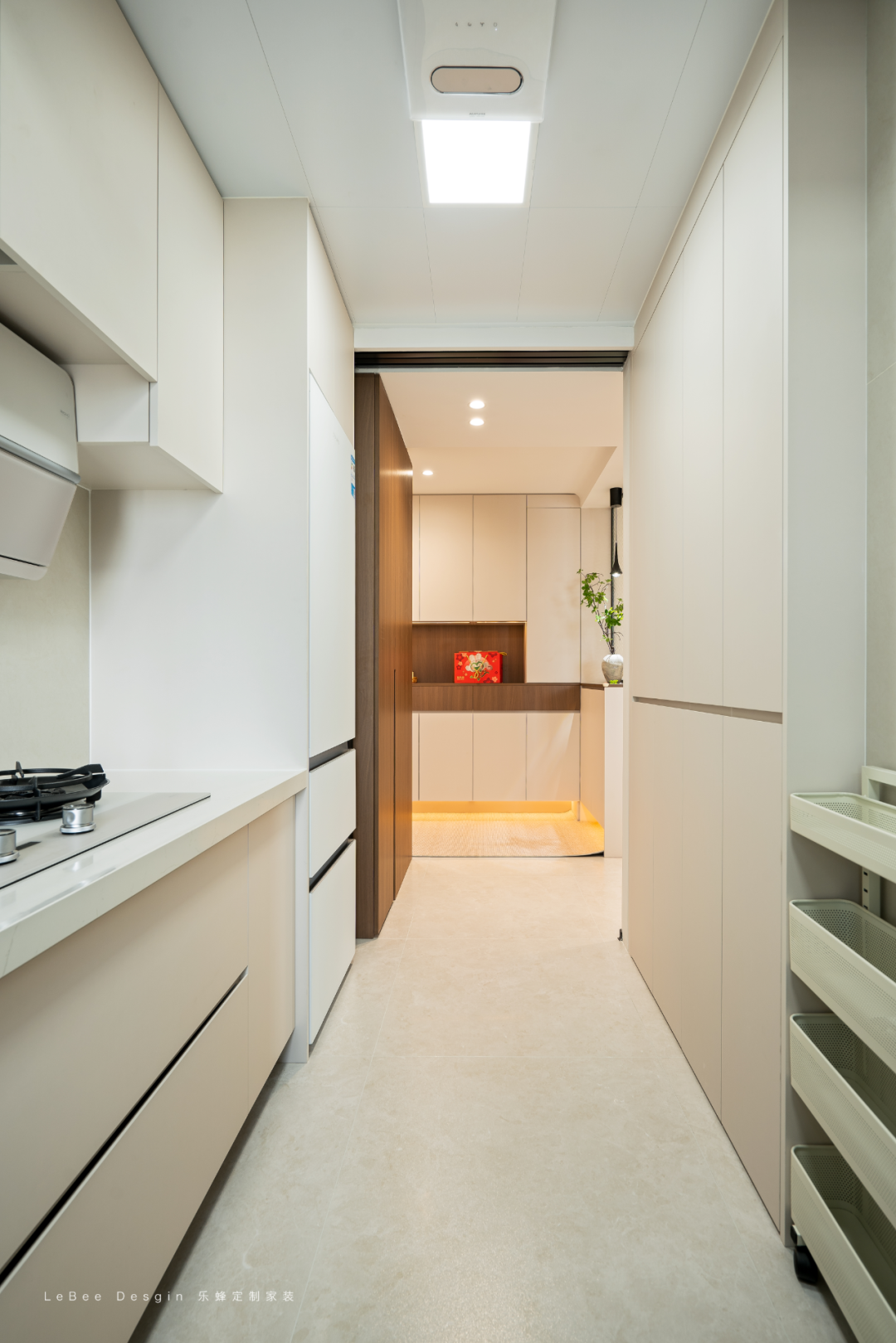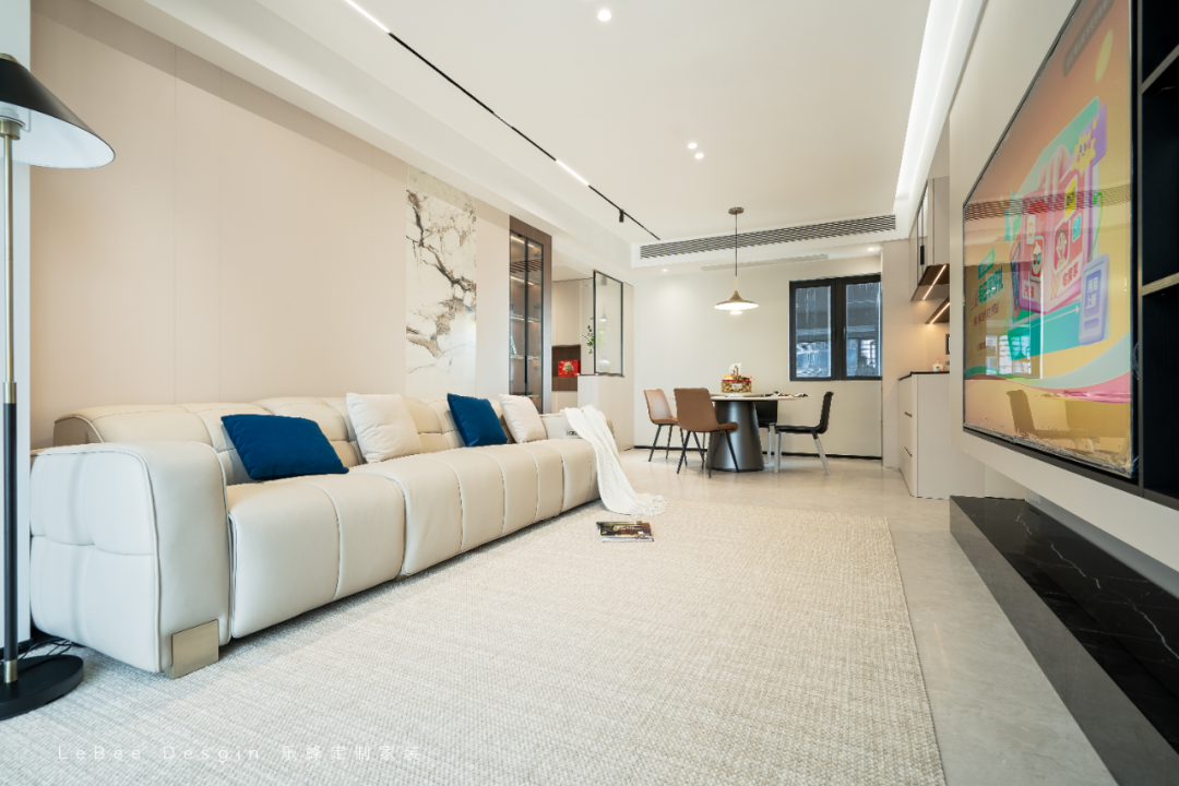 做了無主燈 + 局部重點(diǎn)照明:嵌入式筒燈提供基礎(chǔ)光,吊頂?shù)木€性燈、餐邊柜的內(nèi)嵌燈帶,既補(bǔ)充了光線,又通過光影營(yíng)造出溫馨松弛的居家感。