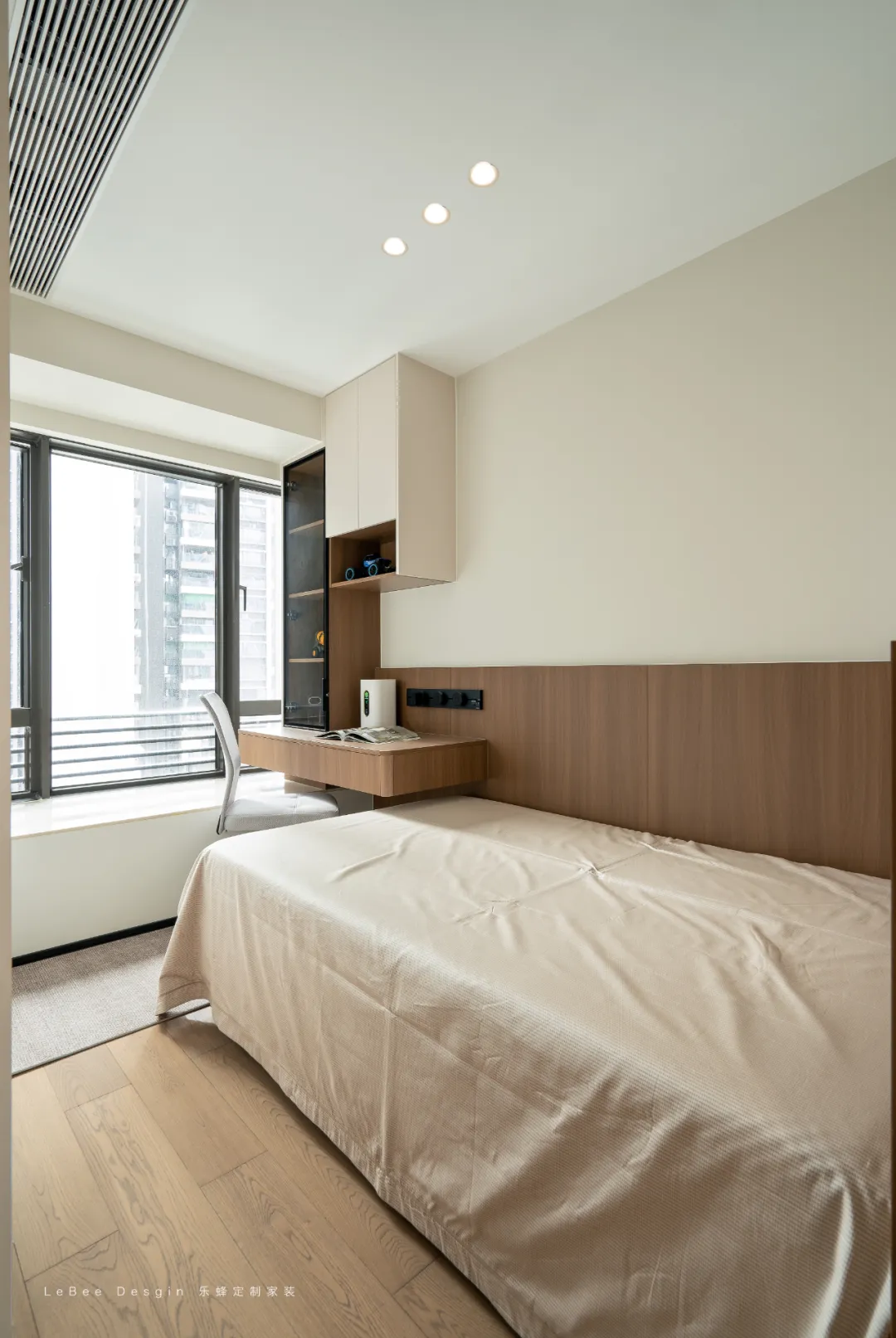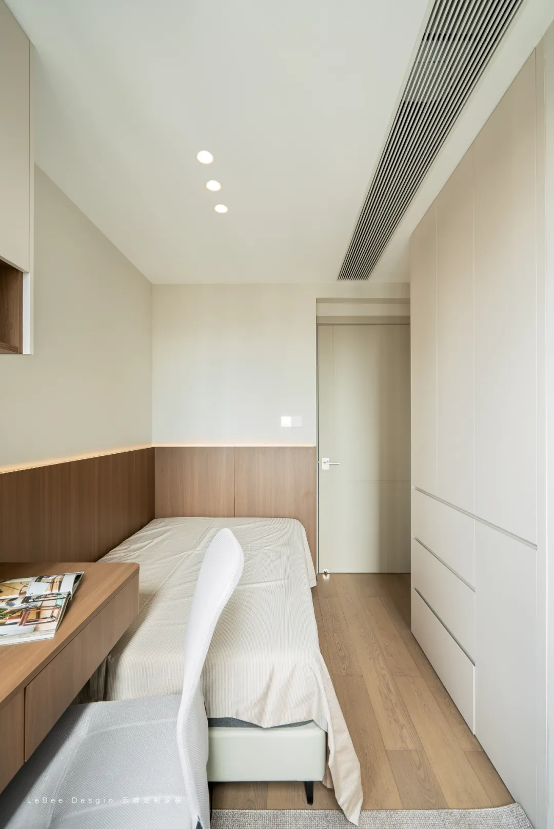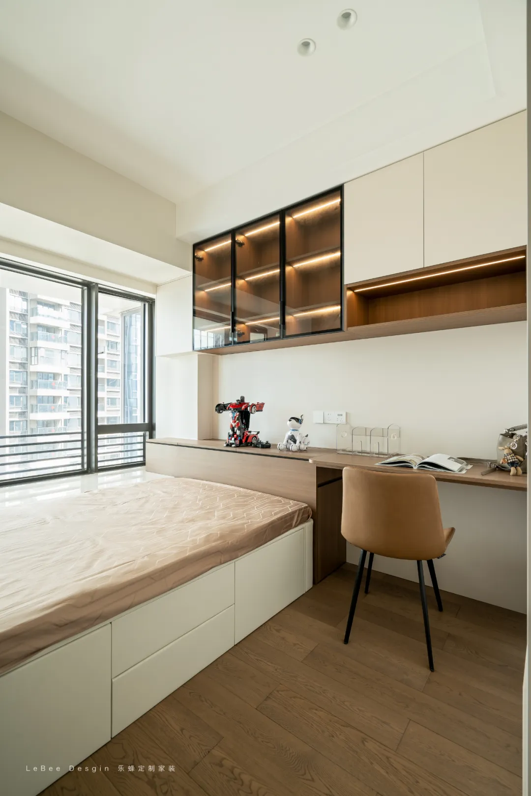 床側(cè)直接銜接懸浮書桌 + 吊柜:書桌緊挨著床頭,不用額外占空間,吊柜 + 開放格組合,既能藏起雜物,又能展示小物件。