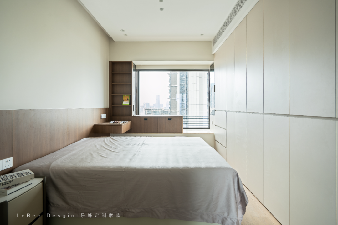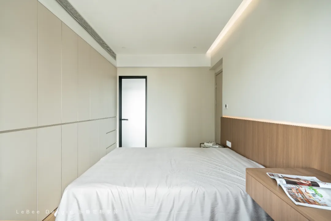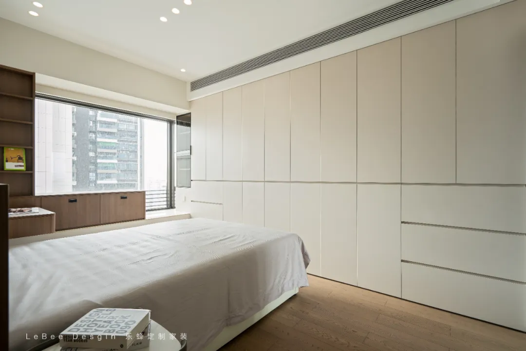 主臥延續(xù)了全屋現(xiàn)代簡(jiǎn)約的風(fēng)格,以米白色定制柜體為主,搭配胡桃木色的開放格和人字拼,在色調(diào)上形成溫暖且高級(jí)的質(zhì)感對(duì)比。