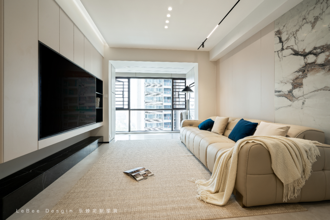 電視墻采用「懸浮柜體 + 開放式格架」組合,減少厚重感,同時(shí)滿足收納與展示需求。