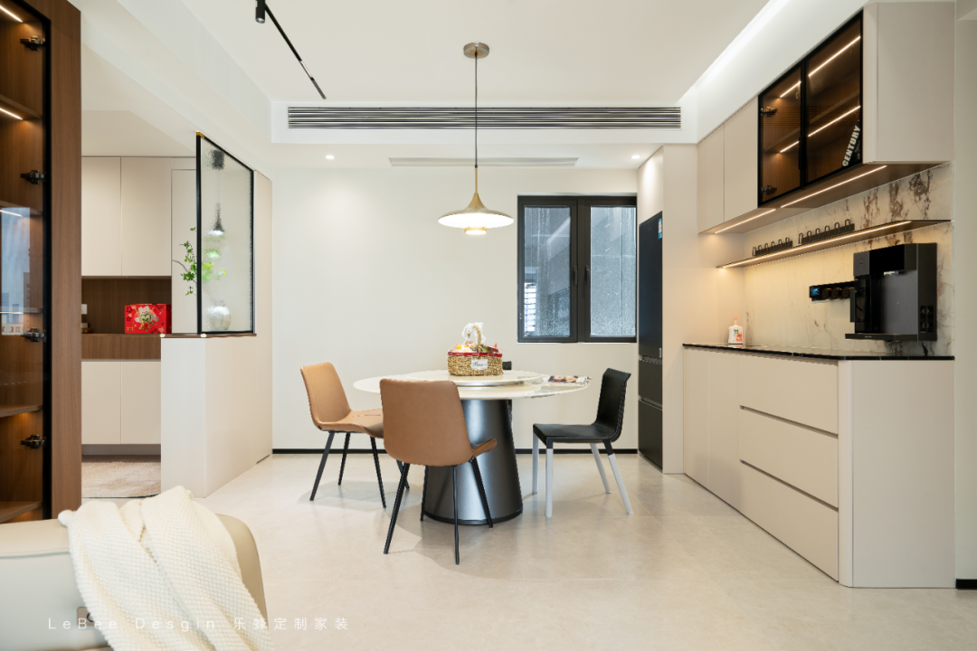 餐邊柜的大理石紋背板 + 金屬掛桿,既提升了精致度,又方便懸掛杯具,小細(xì)節(jié)里藏著實(shí)用性。