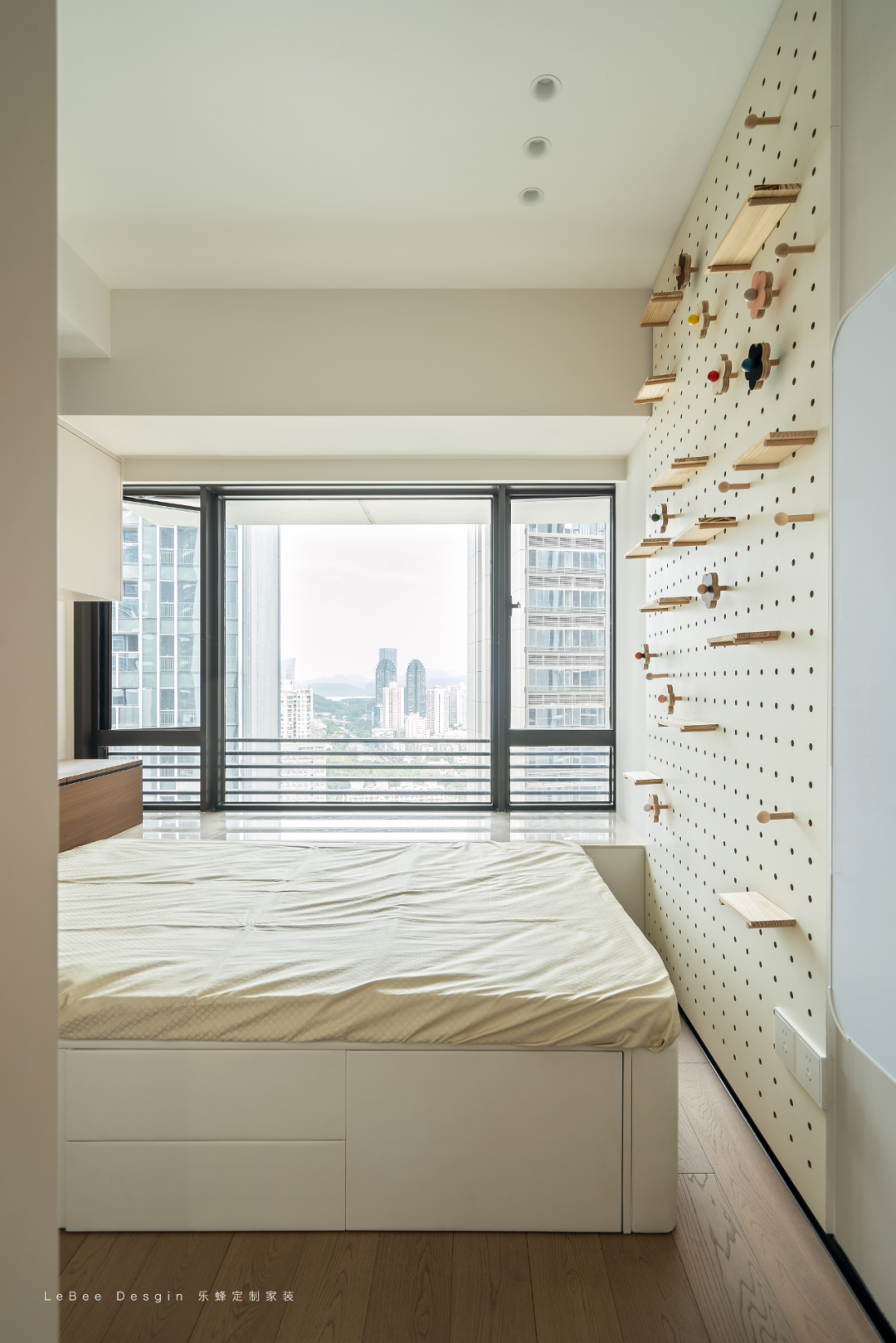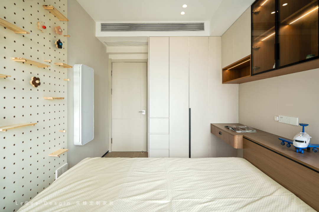兒童房二也是采用淺米色 + 木色的柔和基底,整面墻做洞洞板 + 可移動(dòng)木質(zhì)配件,床體是帶抽屜的榻榻米,藏起換季物品和大件玩具。