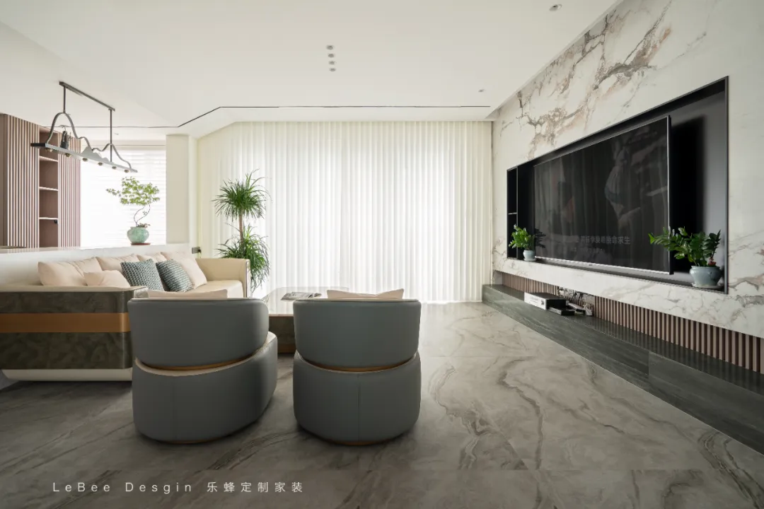 大面積巖板 +木格柵的組合,嵌入電視,下方的收納臺還可擺放書籍或裝飾,兼具美觀與實用。