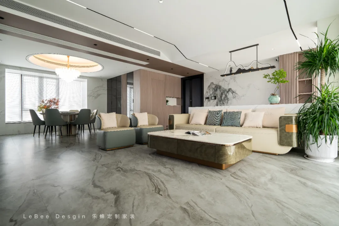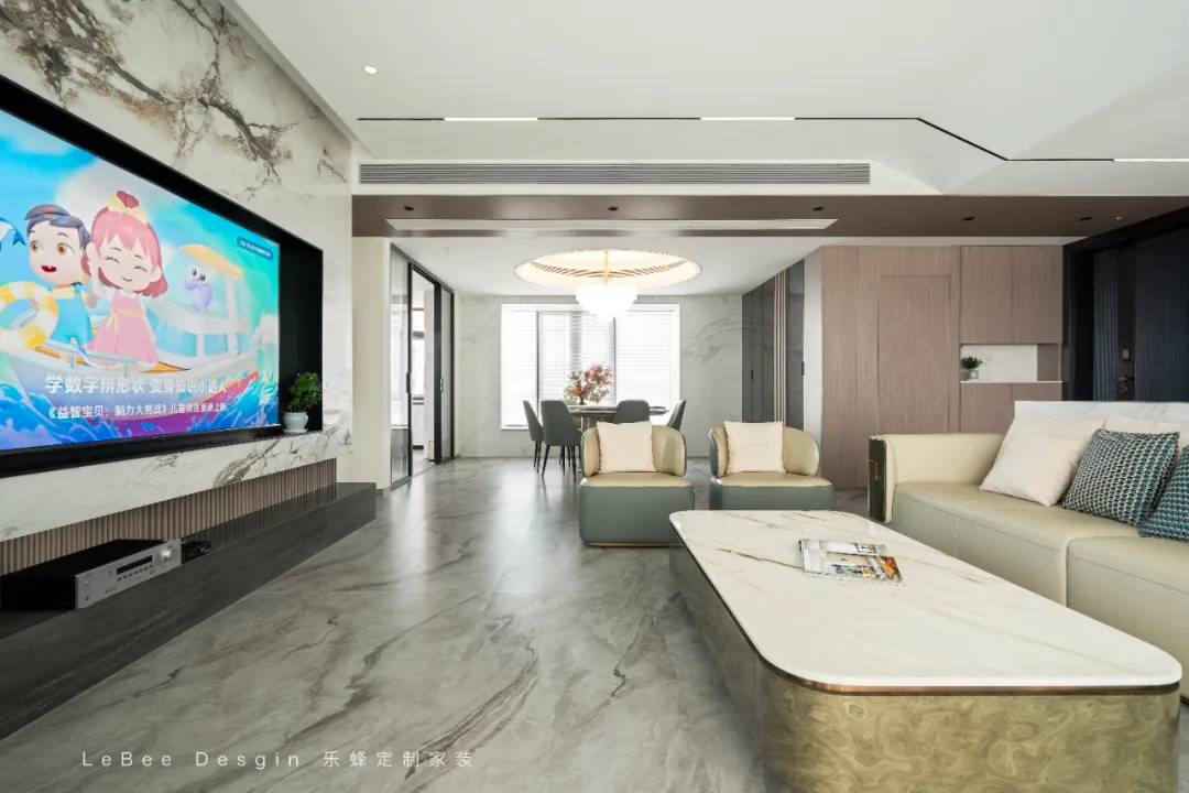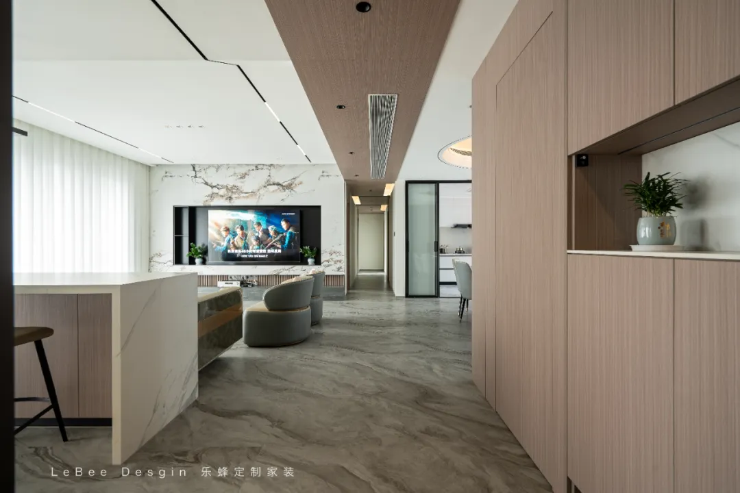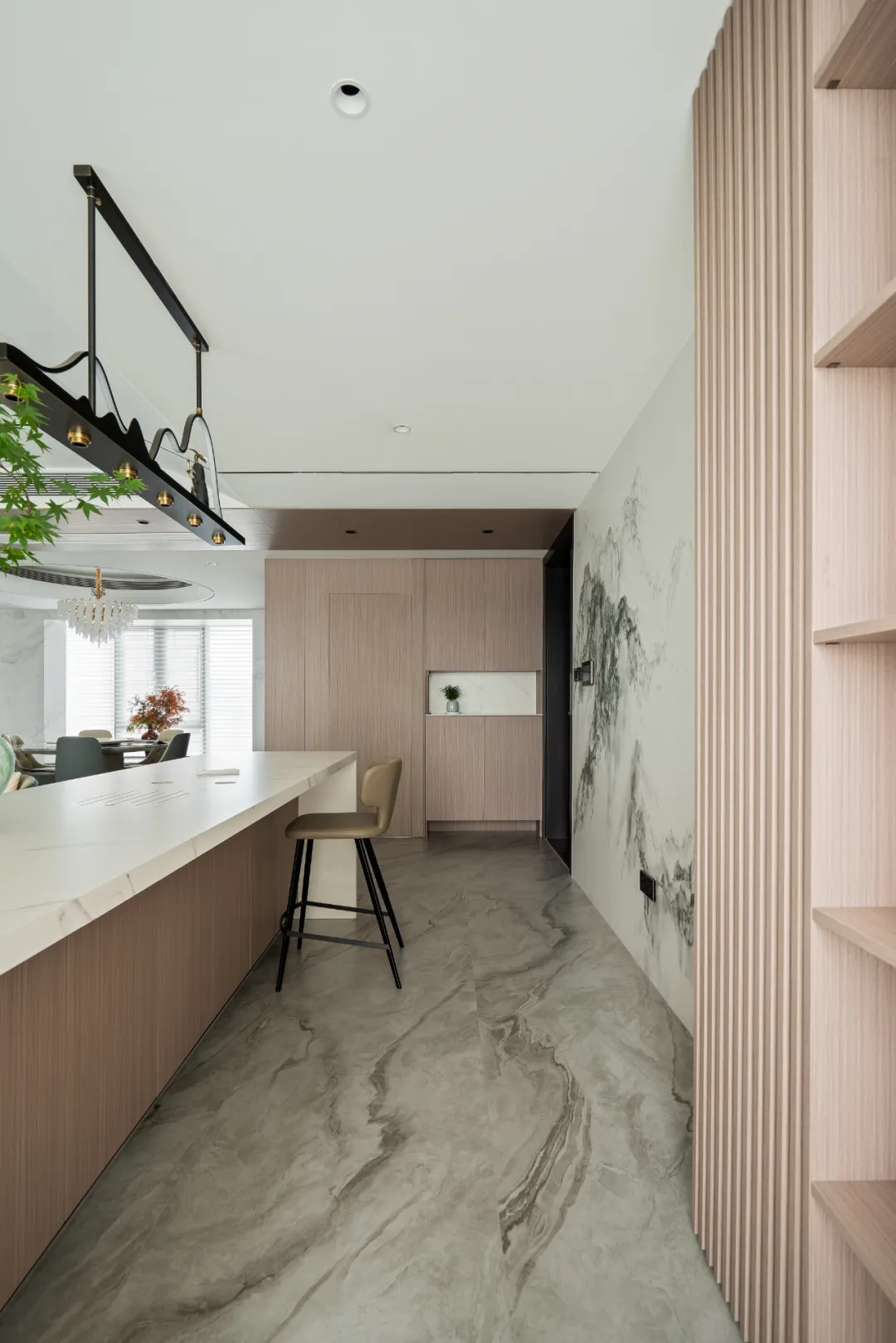 墻面大理石、地面仿石磚、木色柜體的搭配,和客廳區(qū)域完全統(tǒng)一,讓整個空間風格更連貫。