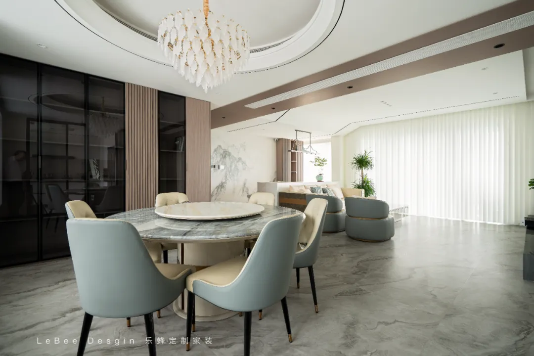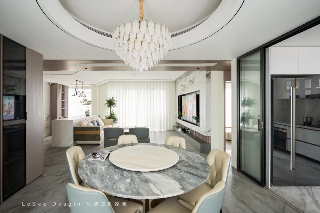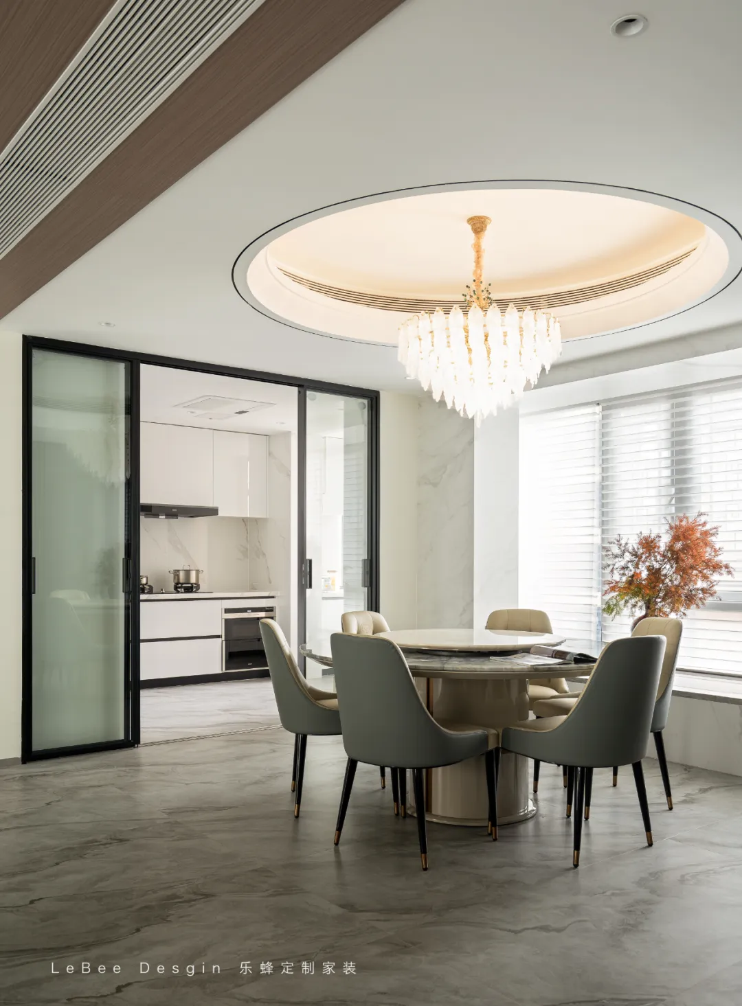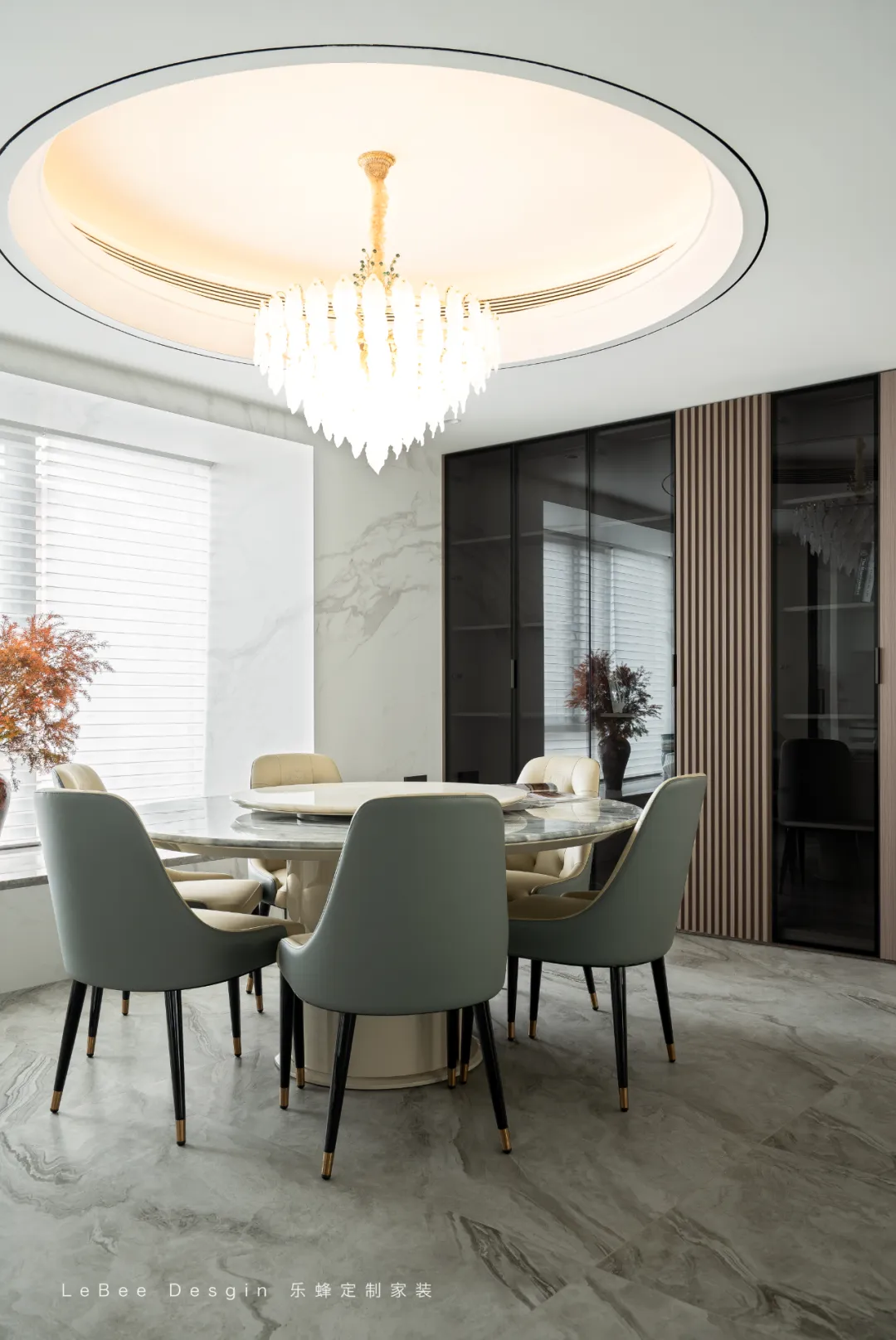 圓形大理石餐桌 + 拼色餐椅,搭配金色腳架細節(jié),輕奢感拉滿;上方的水晶吊燈 + 圓形吊頂燈帶,既呼應了餐桌形狀,又提升了用餐氛圍。