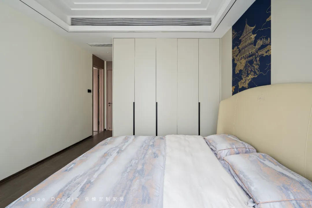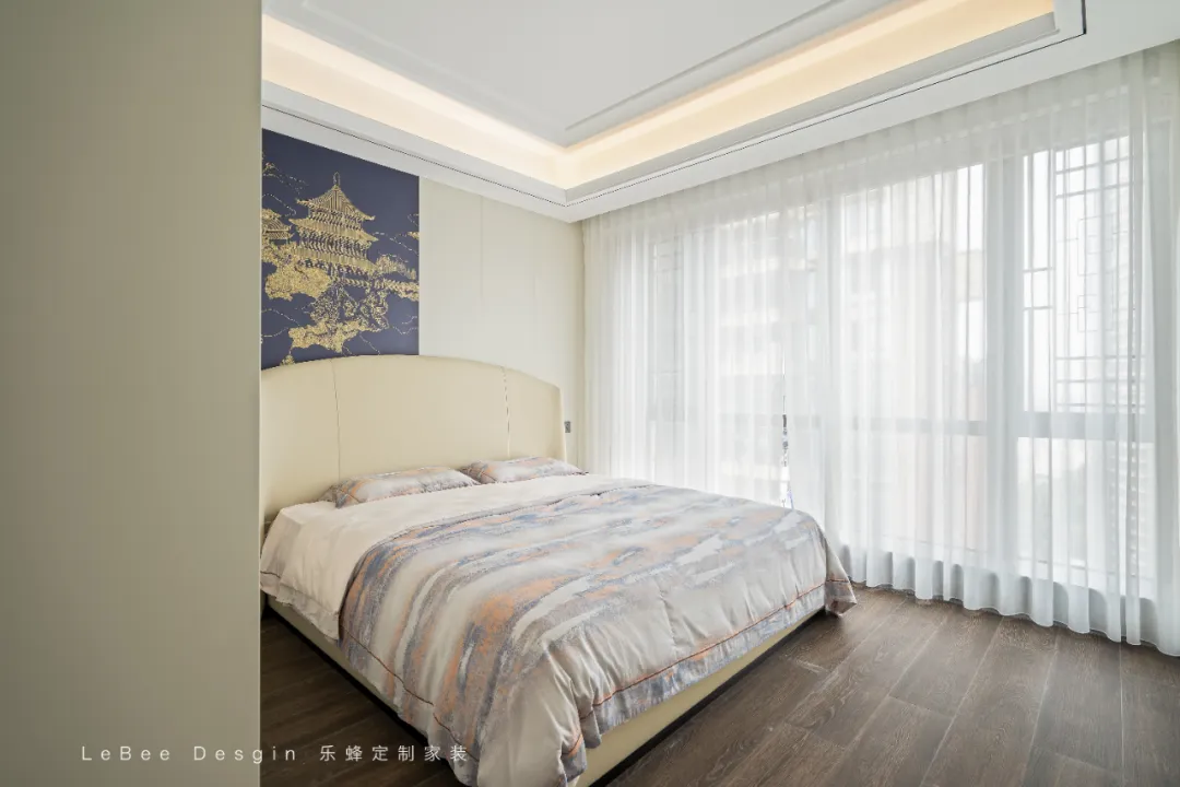 延續(xù)了淺米色的柔和基底 + 深色木地板,軟包床頭保持溫潤質感;搭配帶有水墨 / 肌理感的床品,讓空間更顯松弛。