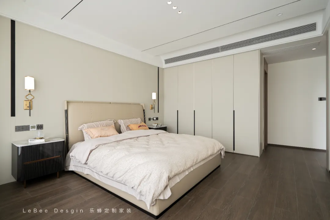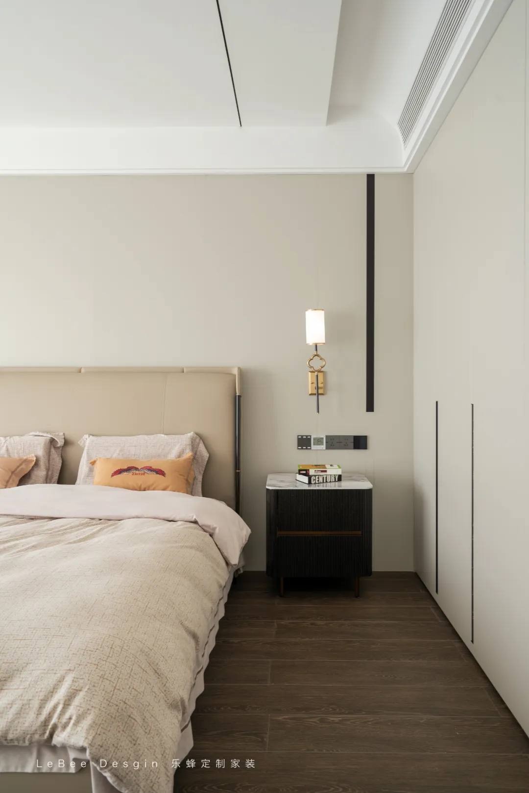 主臥以淺米色、暖杏色為主色調,搭配深色木地板,加上皮質軟包床頭,整體質感溫潤松弛;床頭兩側的金屬壁燈,既做了照明補充,又點綴了輕奢細節(jié)。