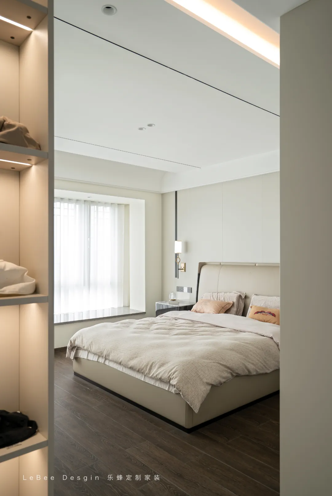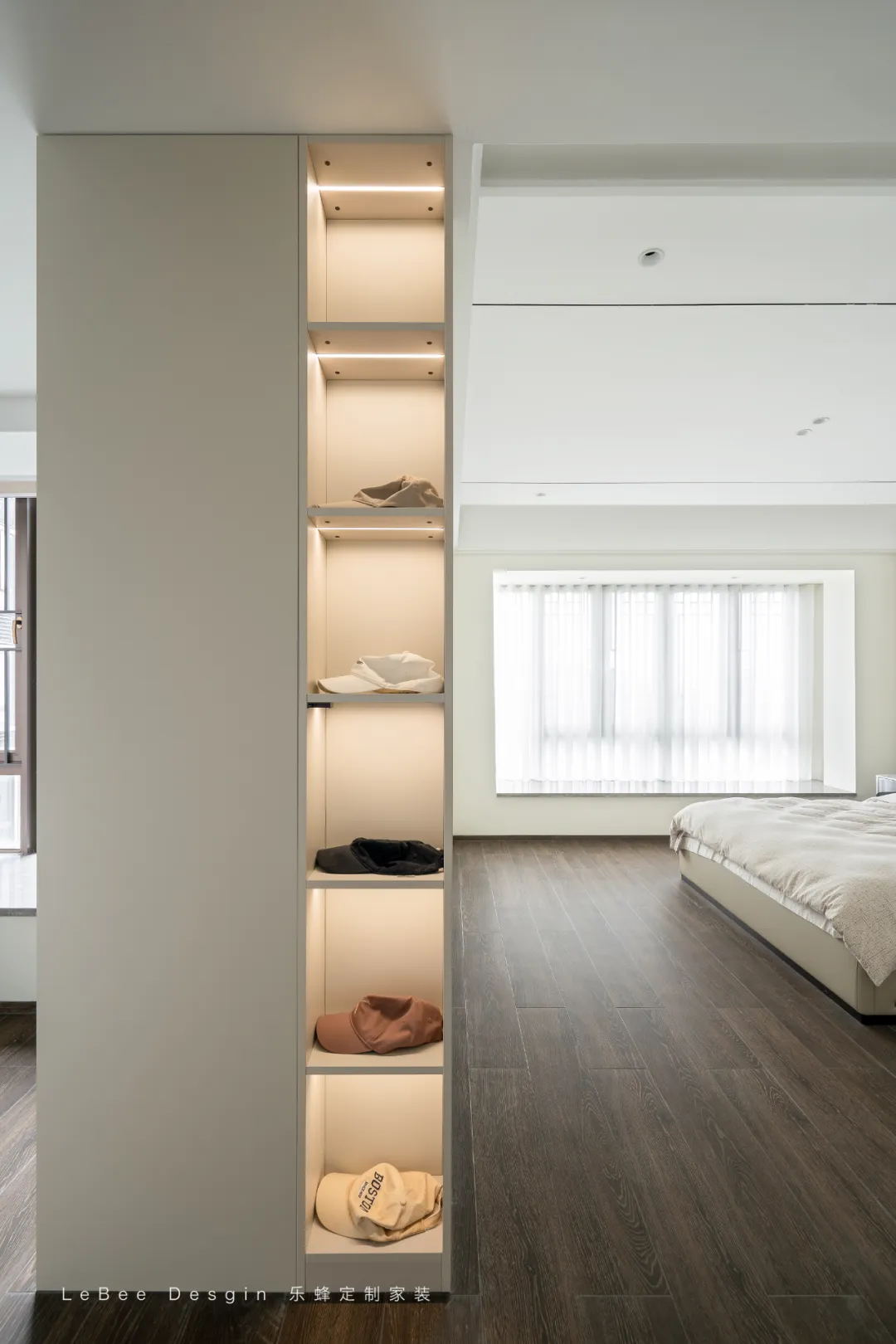 整面墻的嵌入式衣柜,簡潔又能裝;側邊還做了帶燈帶的開放式置物柜,方便收納小物件,燈光也提升了氛圍感。