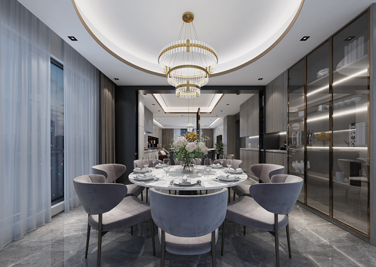 餐廳開放式的格局,更顯空間感;藍(lán)色窗簾令大體足夠親和,西餐桌椅也是十分考究和得體。華麗吊燈的裝飾,打造溫馨的生活氣息