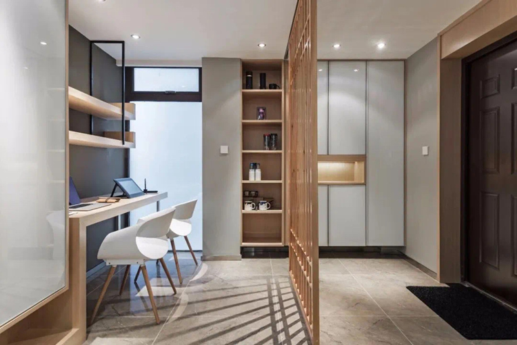 玄關(guān)處可以設(shè)計成小吧臺、小辦公區(qū)、收藏區(qū)等等。高效的利用空間,提高生活品質(zhì)。玄關(guān)雖小,但五臟俱全。