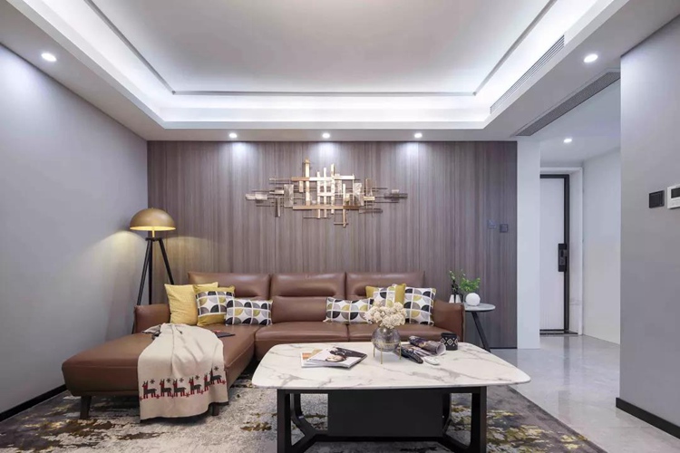 沙發(fā)背景墻以整體木飾面裝飾,中間掛了一組金屬造型,搭配一張棕色的沙發(fā)。