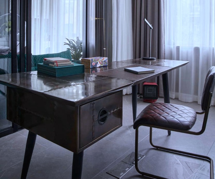 書房不如說是辦公區(qū)域,書桌和椅子顏色搭配非常好,書桌是銅拼皮,做舊風(fēng)格,有一絲復(fù)古韻味。