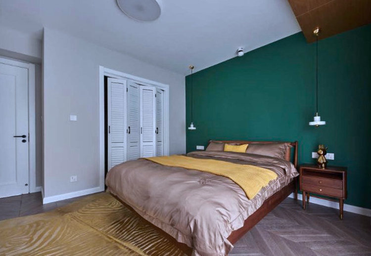 主臥地板是實木橡木色人字拼,業(yè)主個人非常喜歡地上的金色地毯,本來是想放在客廳的,覺得難打理就搬上來了。床頭柜用了胡桃木色,看起來還挺搭的。