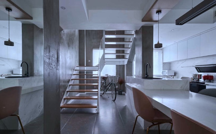 本案是一套復(fù)式案例,開放式廚房,餐廳除非同一區(qū)域,一樓是客廳、餐廳和廚房,二樓是臥室。