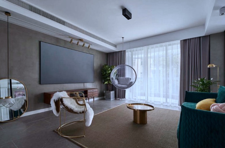 客廳部分比較中規(guī)中矩,除了最簡潔的背景墻水泥漆,胡桃木色的電視柜,因為業(yè)主家里養(yǎng)貓,所以用了劍麻地毯,綠絲絨沙發(fā)也挺好打理。