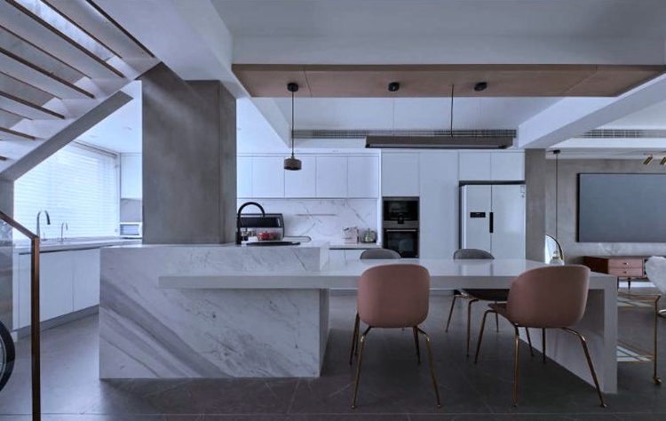 餐廳與廚房合二為一,整體色調(diào)純白加水泥原木,導(dǎo)臺延伸出去與餐臺錯落,視覺上更舒服,裝了個小圓型水槽,洗什么東西都非常方便。