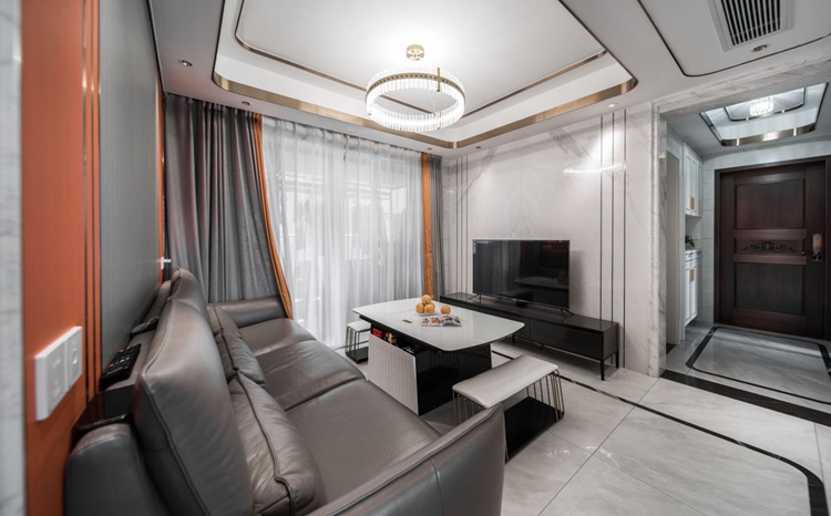客廳,作為家的門面擔當,在電視背景墻的設計上,我們采用了白色大理石的設計,沙發(fā)背景墻,則融入了極簡精致的木飾面,以愛馬仕橙中和整體空間的硬朗,豐富空間的質感。
